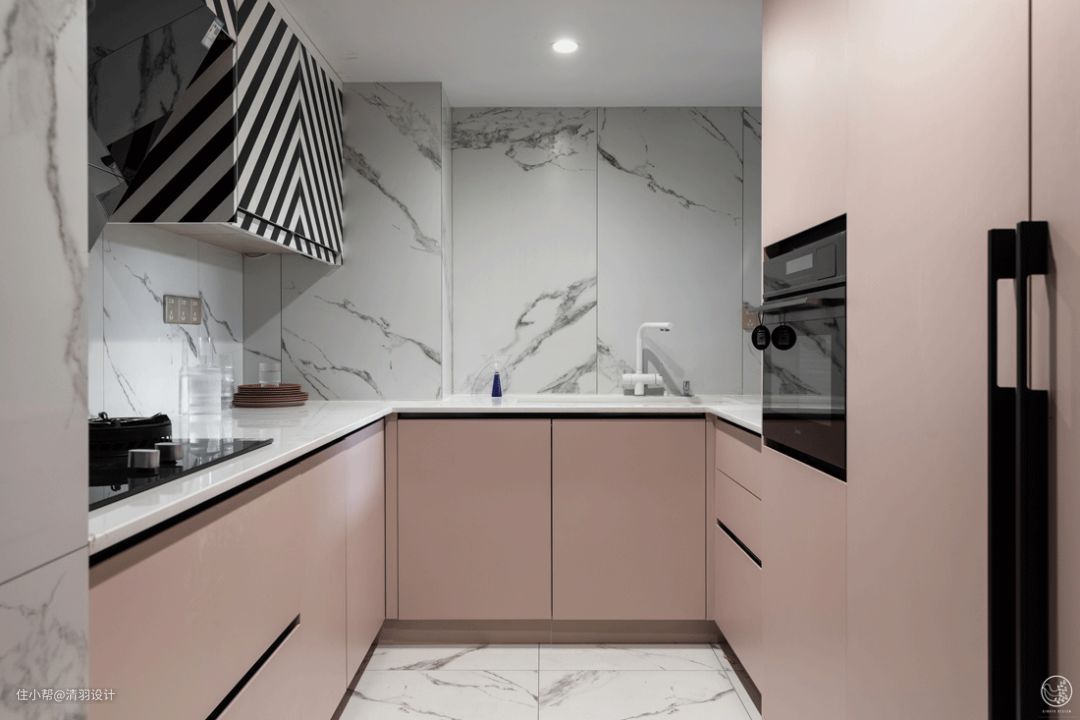 能一眼被注意到的是,黑白相间的几何波浪纹元素是我们在每一个空间加入的“共同点”,点缀也串起每一个空间之间的气息。大理石纹理的墙砖搭配柔和的粉色橱柜,高级感之外隐隐昭示着这个家里谁最常与它“分工协作”。