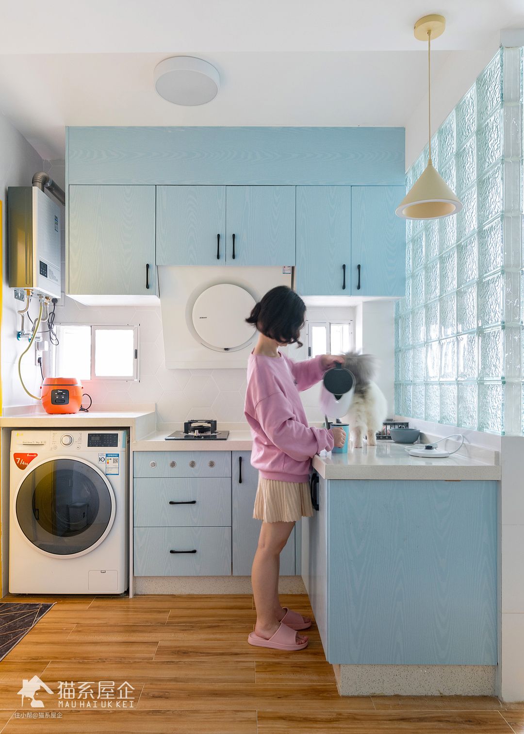 练瑜伽的猫小姐,吃得也很健康,喜欢自己做沙拉或者蒸煮的事物,基本很少煎炸油烟。 所以我们大胆的取消了原来厨房的墙壁,为她设计了一个开放式的厨房。 另外多说一句,对于喜爱中式煎炸烹饪的朋友来说,只要拥有一台足够强劲的抽油烟机,开放式厨房也能轻松hlod住呢~