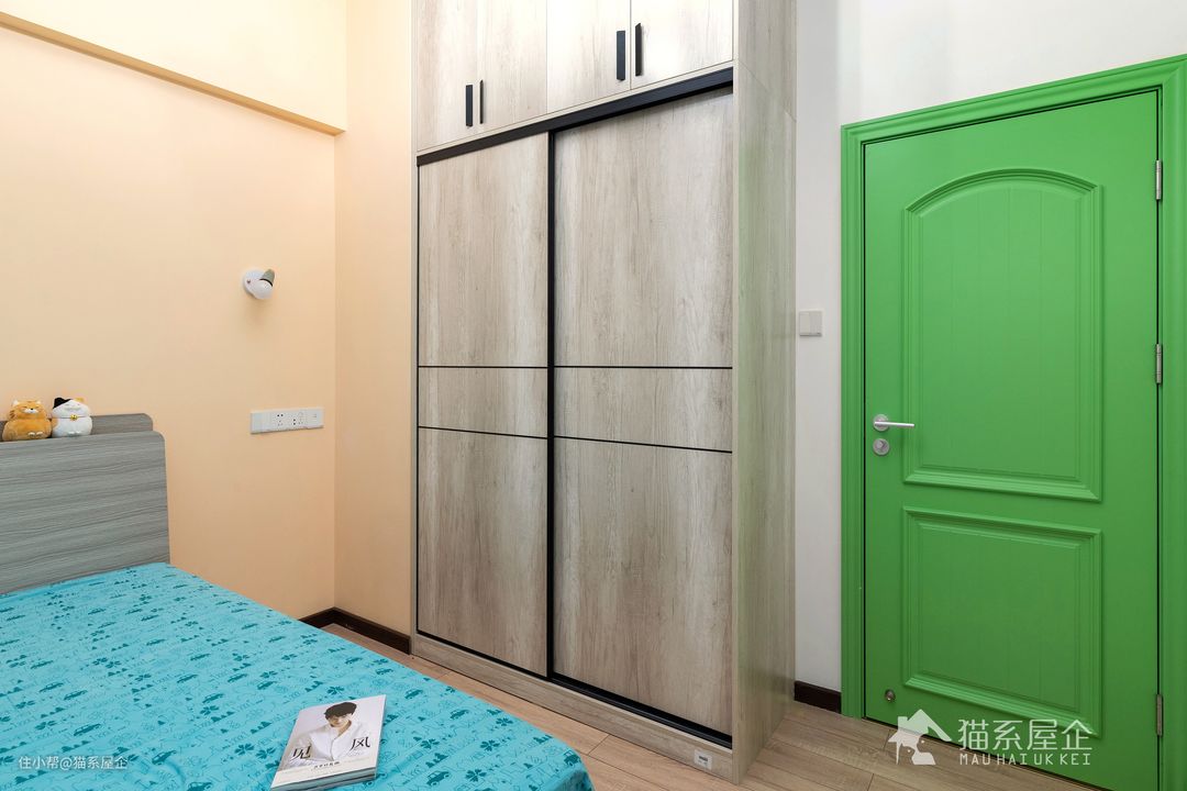 女孩子的衣柜里总是少一件衣服,这话没错。 我们专门为爱美的猫小姐设计了一面“顶天立地”的衣柜墙,下面装当季的衣服,上面的柜子可以储存换季的衣服被子,兼具美观与实用。