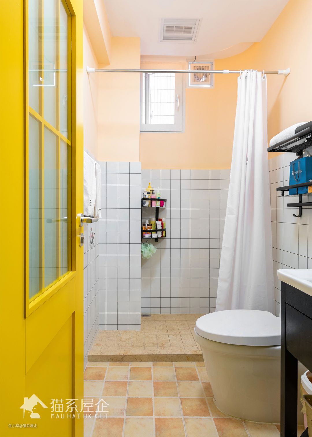 根据猫小姐的需求,我们给这个卫生间赋予了三个功能:沐浴、方便、洗漱化妆。