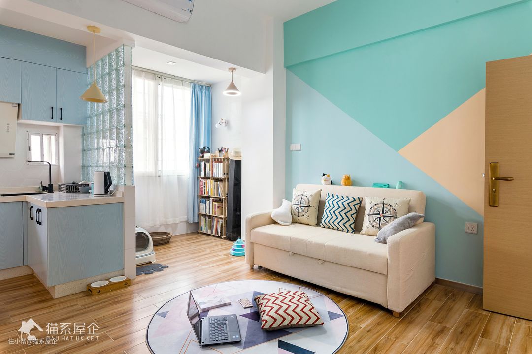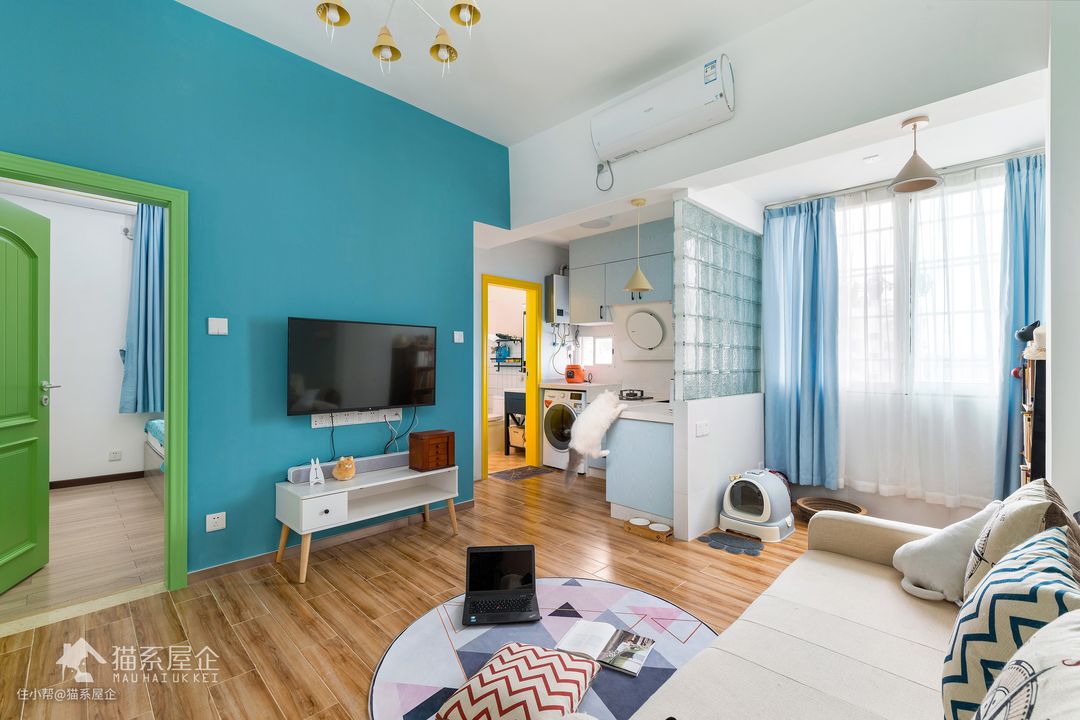 空间布局的改变,让猫小姐一回家推开门看到的是一个以蓝色为主色调的开阔空间。 电视背景墙的主色调用了猫小姐喜欢的Tiffany蓝,她说是之前在猫系公众号看到我们的作品“Tiffany”(可以在主页找到作品“Tiffany”),瞬间感觉被强力种草了,所以一定要用同款颜色。 同时,小户型非常重要的一点是合理利用空间,所以选择了壁挂式电视机和小巧的电视柜。