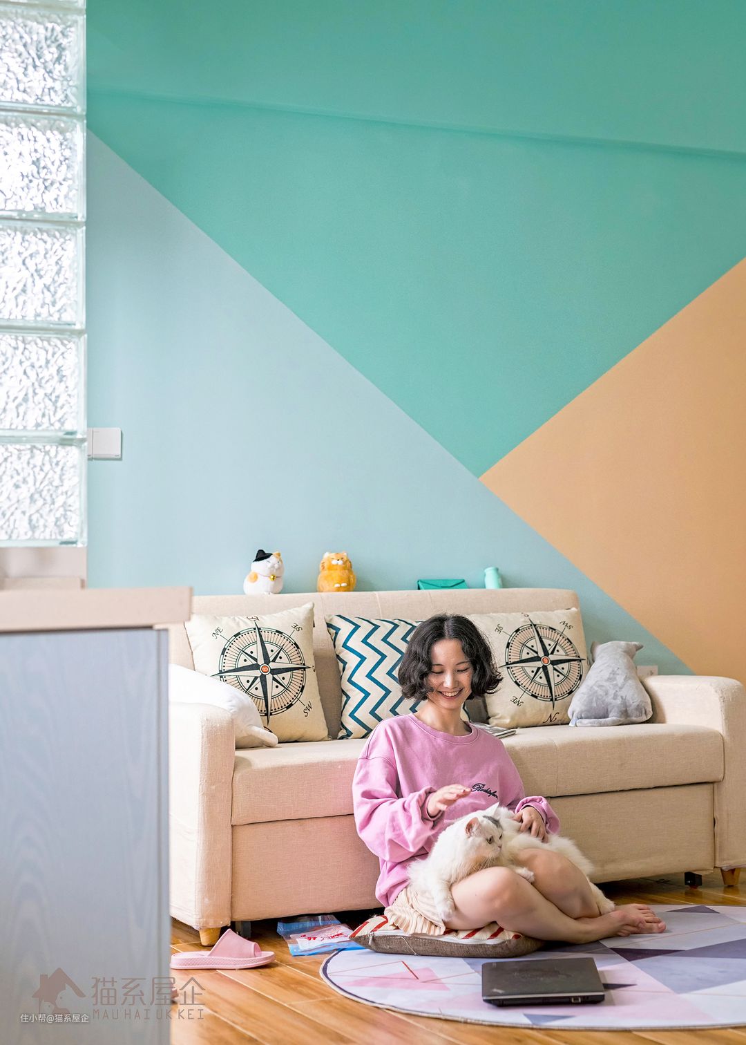我们用马卡龙拼色填充了沙发后的墙面,色块的碰撞让空间律动起来,每天起来看到这样明媚的颜色心情也不自觉地跳起舞来。