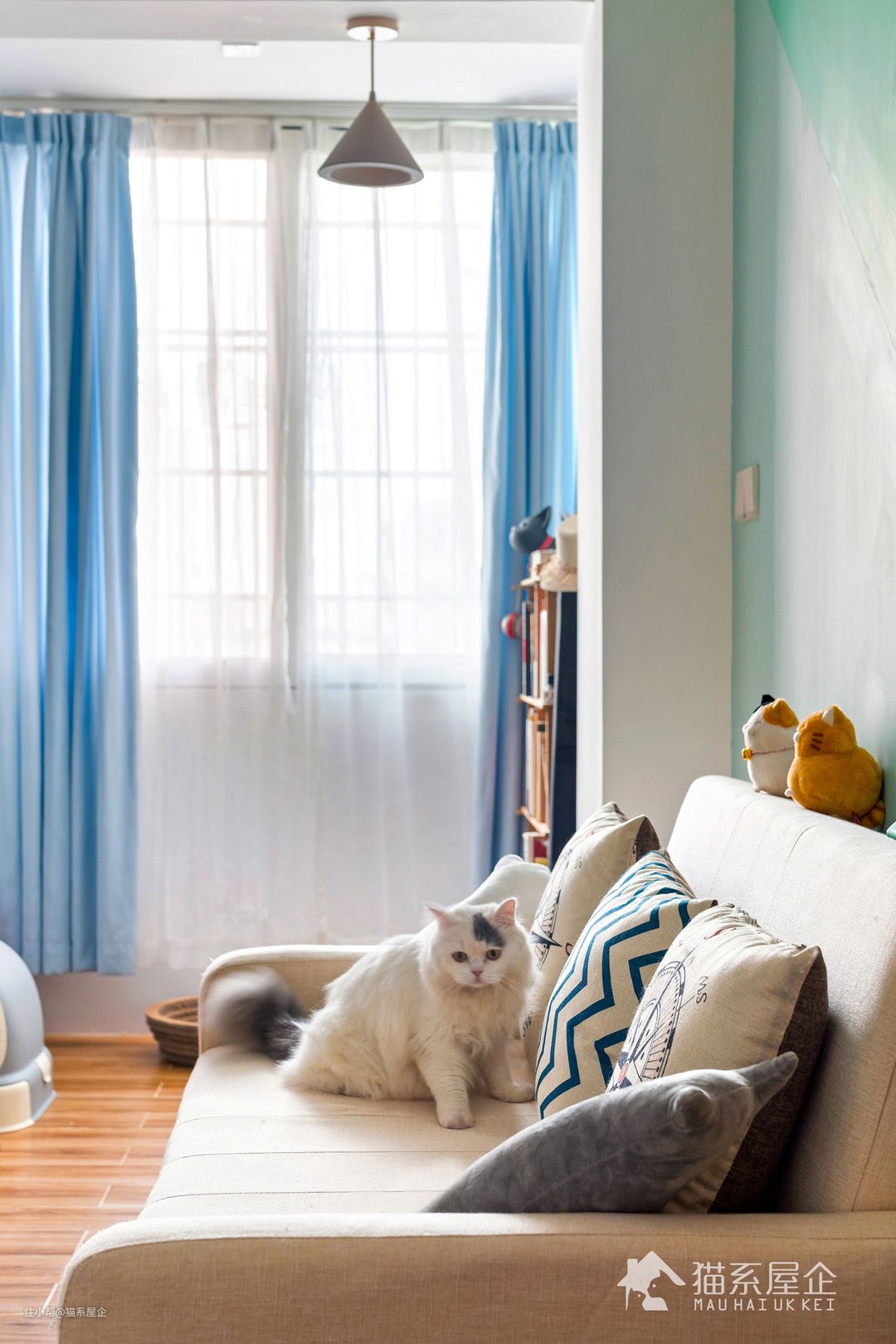空间布局的改变,让猫小姐一回家推开门看到的是一个以蓝色为主色调的开阔空间。 电视背景墙的主色调用了猫小姐喜欢的Tiffany蓝,她说是之前在猫系公众号看到我们的作品“Tiffany”(可以在主页找到作品“Tiffany”),瞬间感觉被强力种草了,所以一定要用同款颜色。 同时,小户型非常重要的一点是合理利用空间,所以选择了壁挂式电视机和小巧的电视柜。