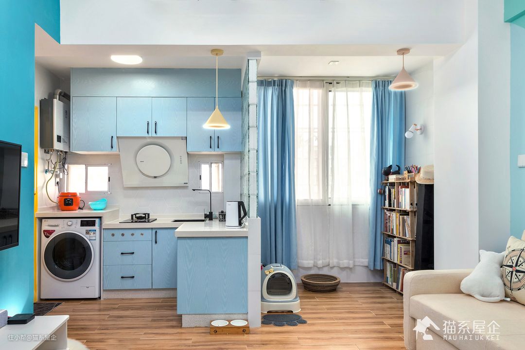 从整体上看,通过色彩和灯具的呼应,让开放式厨房与右边的休闲区保持了视觉上的完整,又实现了功能的划分。 猫小姐入住一段时间后反映这样的设计不仅好看,而且好用又方便打理,对于上班忙碌的猫小姐来说在合适不过了呢。