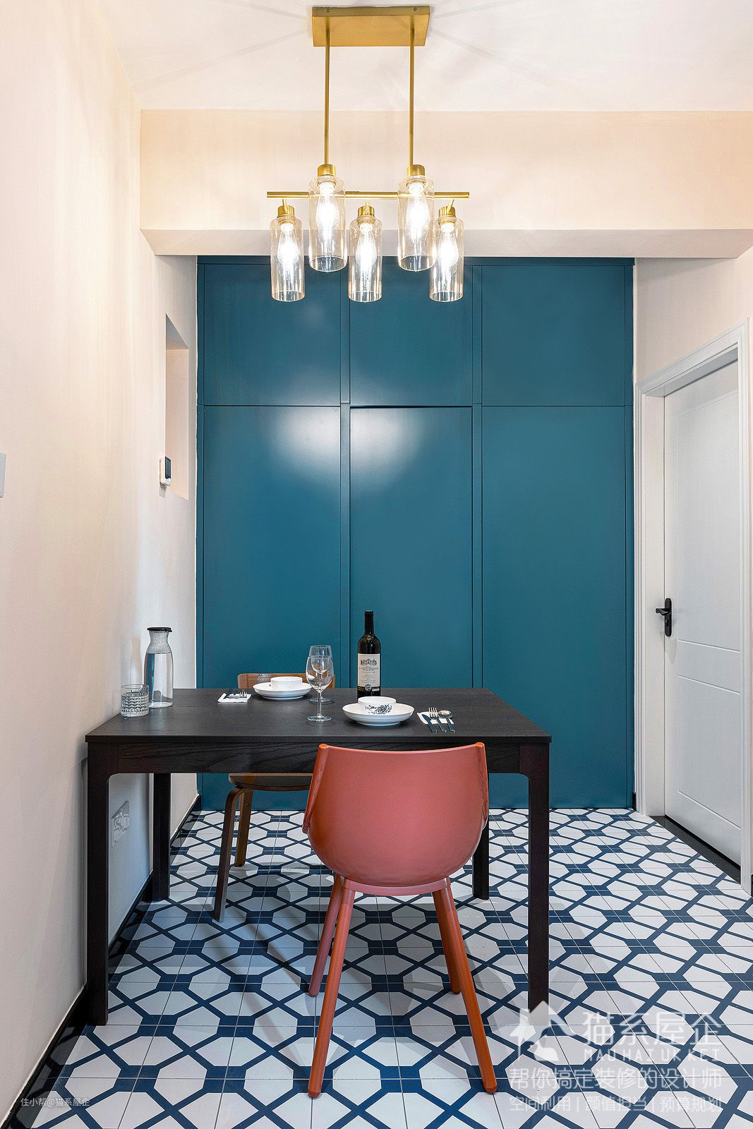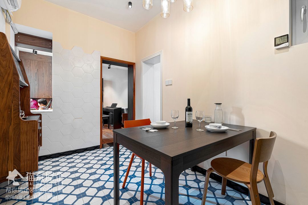 餐厅铺设了和前面玄关一致的蓝白色花砖,因为这是一个内置空间,跳跃感的花砖能让整个区域瞬间活跃起来。吃饭的心情都会变好呀~