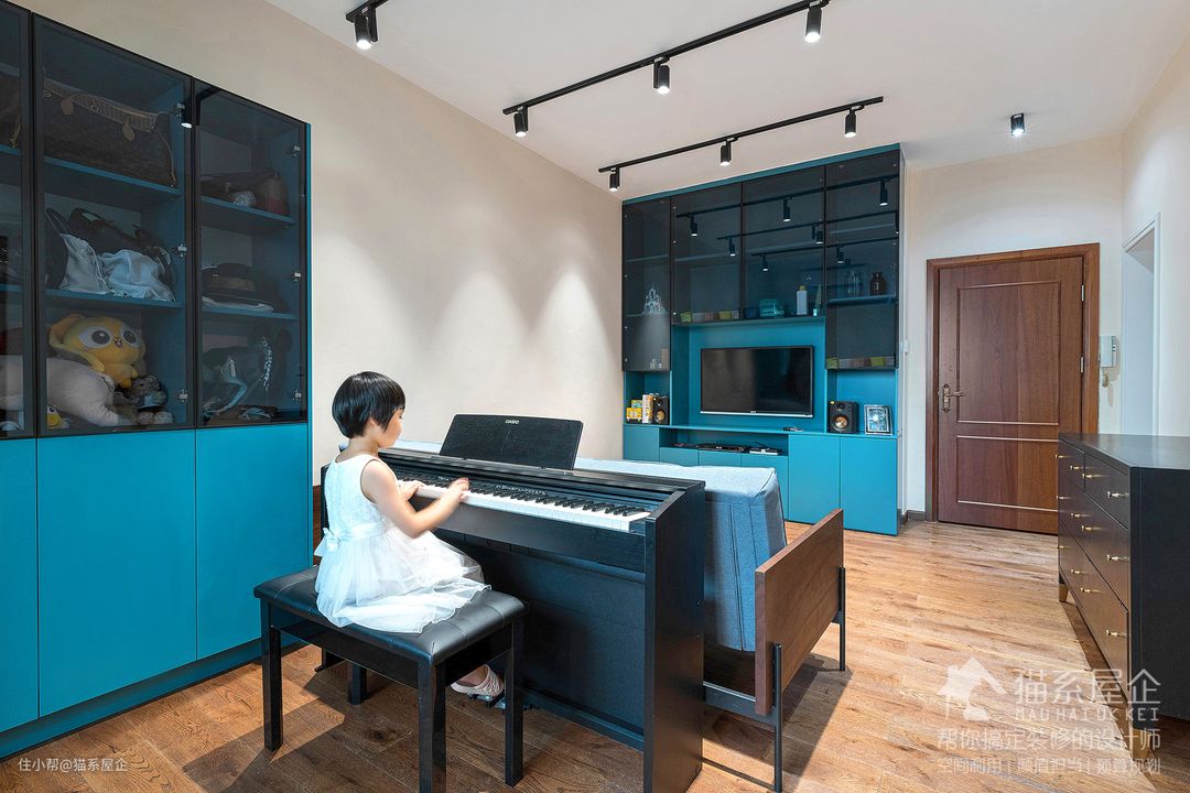 客厅没有安装主灯,利用两排射灯解决光源问题。小巧简约的射灯能拉高整体空间的层高,简约又不抢镜。 空间一分为二后,由姐可以在后面的区域尽情弹琴了。自从不用和爸爸妈妈分开,能待在一个空间练琴后,由姐的积极性都上来了。 由妈坦言并没有给由姐选择钢琴这条路,日常的练琴只是为了让她练矫正音准、学习乐理和锻炼左右脑分离罢了。后期会换学什么,也还是个未知数。只希望由姐有自己喜欢做的事情就行。 不得不说由妈是个新时代好妈妈了~