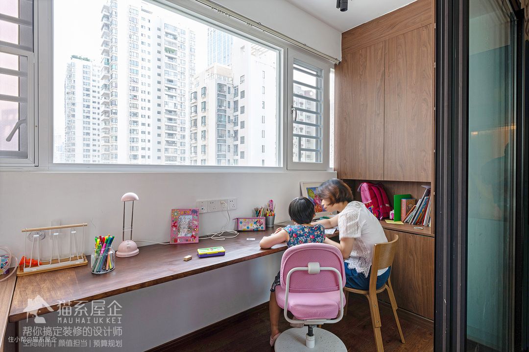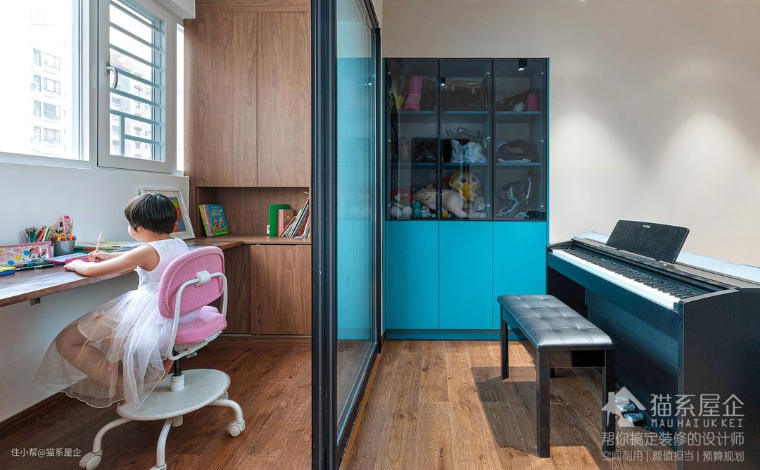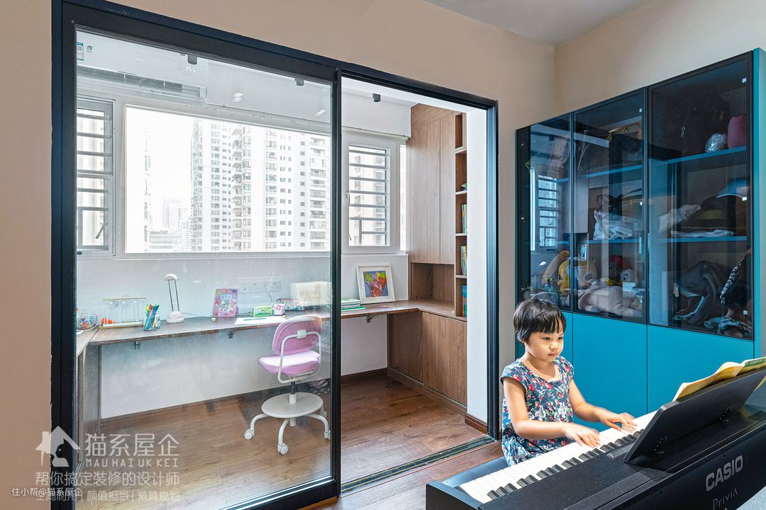 同样用了黑框玻璃隔断,由姐独自学习的时候,既可以和爸爸妈妈在同一个区域,又能安静学习。 孩子喜欢的彩色跟冷静沉着的胡桃木色居然也能擦出和谐的花火~