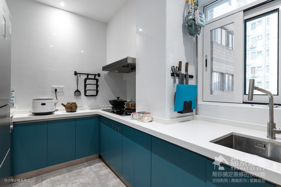 扩容后的厨房宽敞明亮,同样是蓝色系的柜门,L型的操作台面,从此成为由妈大展身手的居心地。 整屋的门、包括厨房的窗框、台面都是百搭的白色系的,蓝白色的养眼程度让人像是进入了地中海的度假区~