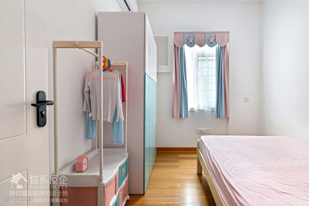 收纳也选择了同色系的柜体,开放式衣架方便随手挂放。孩子的房间,开放式的衣架,更能培养她独立收拾衣物的主动性。 窗帘也是粉蓝拼色的,星星的双色窗帘是整个房间的点缀。 儿童房基本没有多余的设施,因为妈妈想让已经读小学的娃进入一个小大人模式,所以希望她适应正常的起居、学习状态,所以只在客厅设置了女儿的玩耍区。
