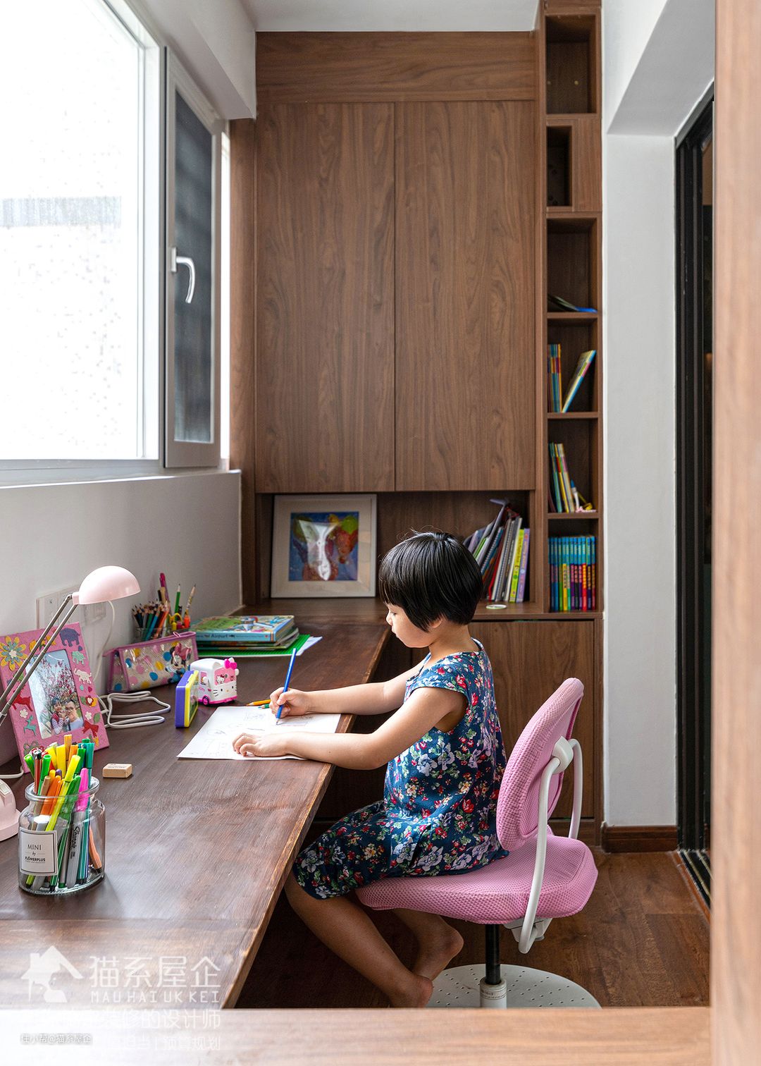 胡桃木色系的学习桌让孩子沉静在书本的海洋里,但办公椅依旧是少女粉。