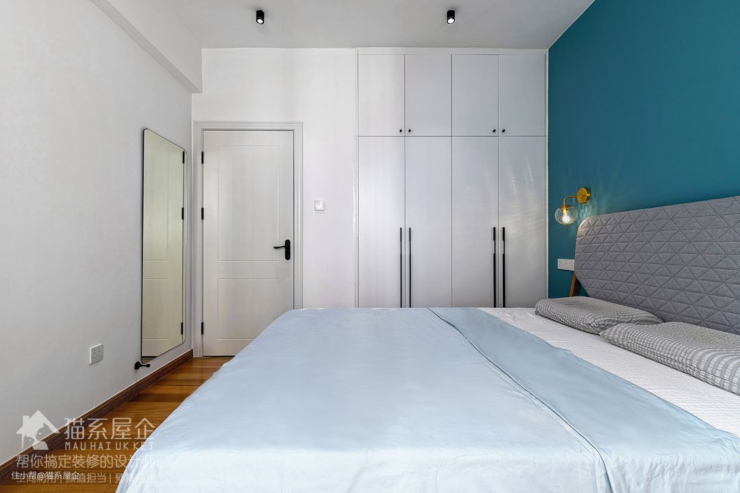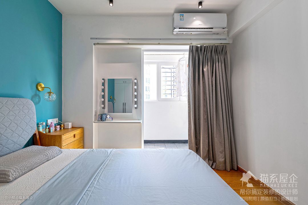 主卧带阳台,也刷了整面墙的蓝色,配上香槟金的床头灯很显精致,一股妥妥的轻奢风扑面而来。小小的床头灯满足了由妈睡前阅读的习性。
