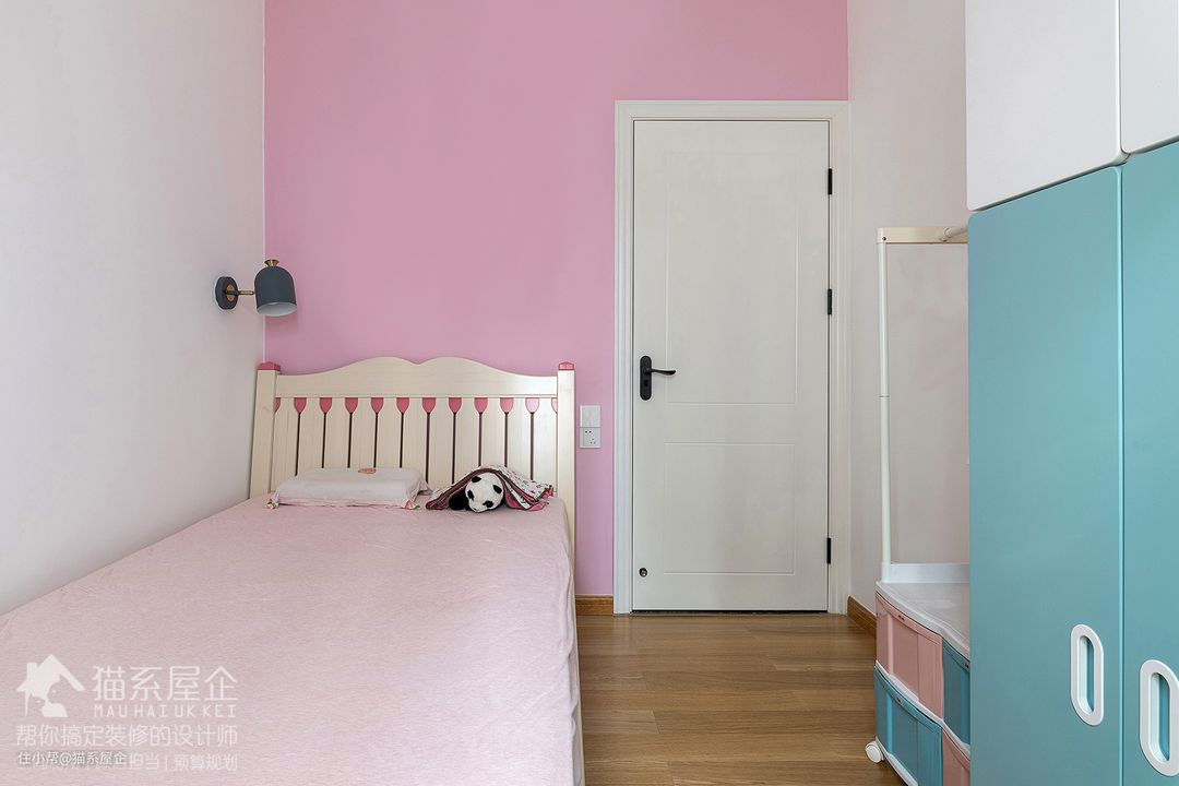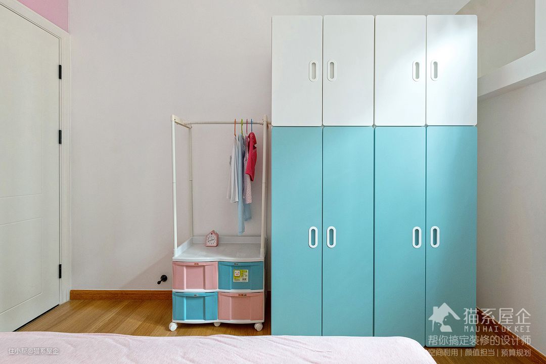 由姐的房间是粉蓝配。我们并不用强烈地去区分小男孩一定要用蓝色,小女孩一定要屈服于粉色。
