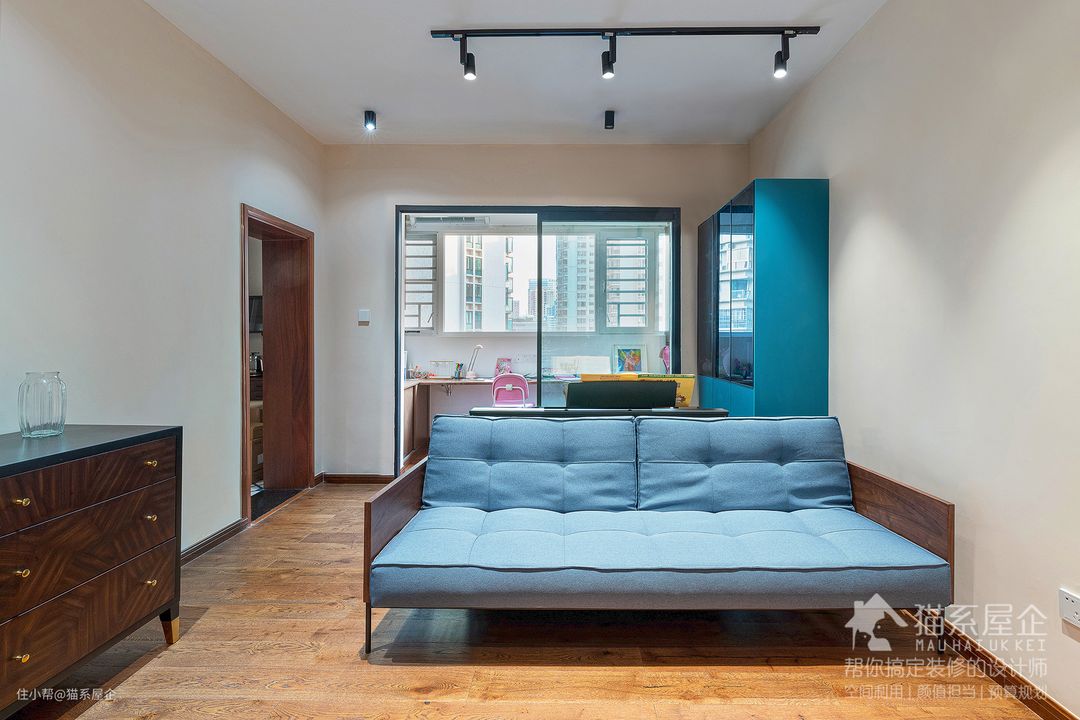 客厅是进门后的第二个开放区域。我们根据由妈的需求尽量简化了这部分空间的家具。 只设定了整面墙的电视柜、沙发和边柜作为固定家具,后期使用的时候可以灵活变化为由姐的游乐园。 边柜和右手边的蓝色储物柜以及整面墙的电视柜充分满足了由妈的收纳控需求。整个客厅看起来“空无一物”。