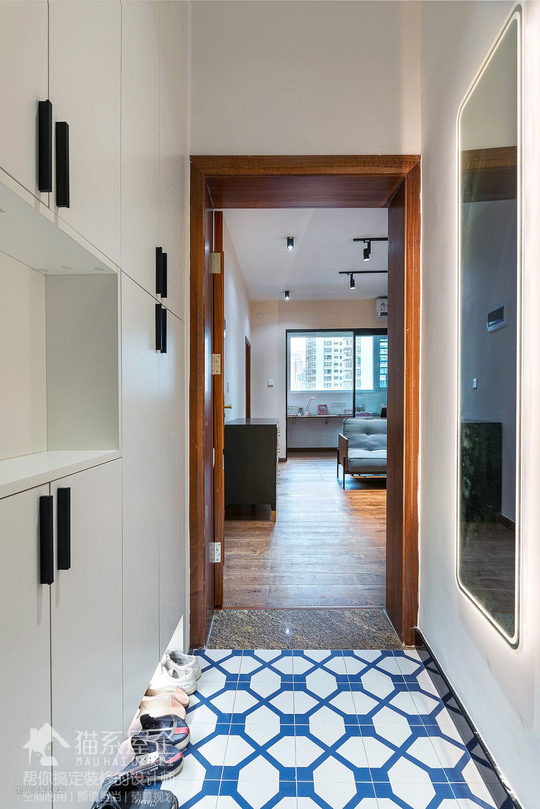 玄关作为一个家的回家担当,素有“玄关不好看,我就不回家”一说。 的确,作为一回家就要待着的过渡区域,跟大多数业主一样,由妈希望这个区域既具功能性,又有颜值可赏。 猫叔根据业主的喜好,设计了跟餐厅一样的花砖地块,区分和客厅功能的同时,又让整个家明亮活泼起来。 整面墙的白色柜体,在视觉上一点儿不显得拥挤,配上黑色拉手的点缀,现代感满满。 由妈回家的动线一般是换鞋-挂包-更衣-偶尔需要卸妆-直奔厨房做饭,玄关承担了这大部分的功能。 户型的设定决定了这部分是传统的长条形,起到天然的阻隔作用,不会在开门时便对里面一览无余,保障了一定的隐私。 这种户型在风水上也有不会露财的说法哟嘻嘻(突然小迷信一下)。
