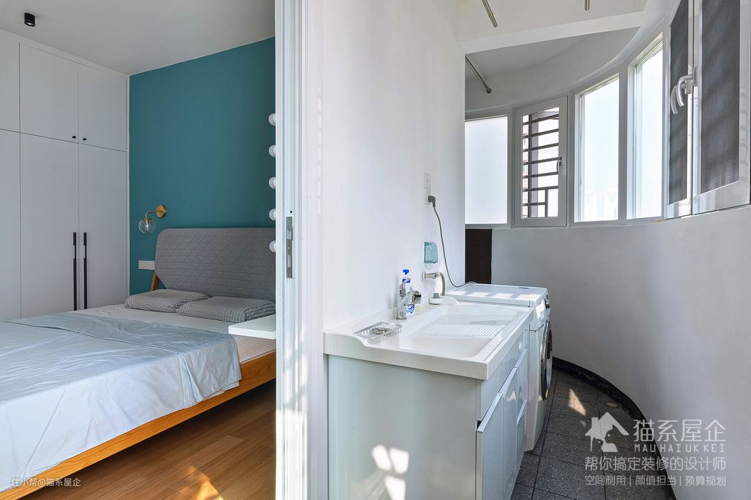 主卧的阳台有单独的洗漱区,方便早晨的洗漱,并且这个是整个家的洗衣晾衣区,在功能划区上也十分合理。