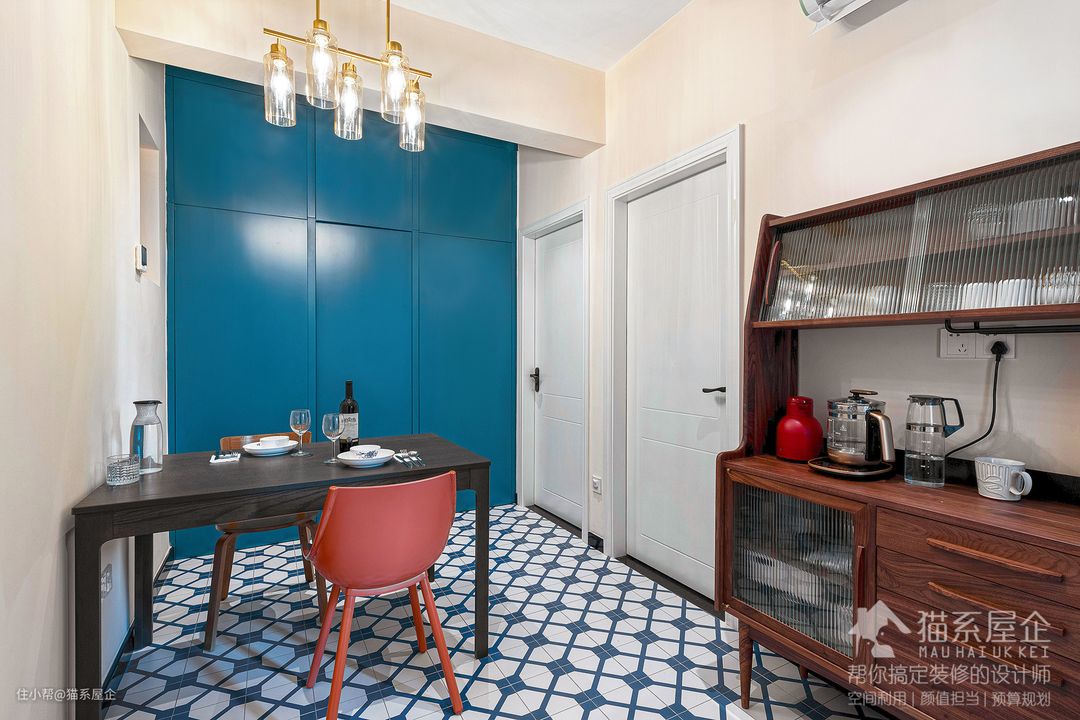 餐厅也定制了一整面墙的收纳柜,柜门的颜色和花砖的颜色交相呼应。 定制的通顶柜且无拉手的情况下,既不会缩小空间的视觉感,相反因为整体造型为竖向且柜体本身很薄,满足收纳功能的同时还拉高了整体的空间感,一点也不压抑!