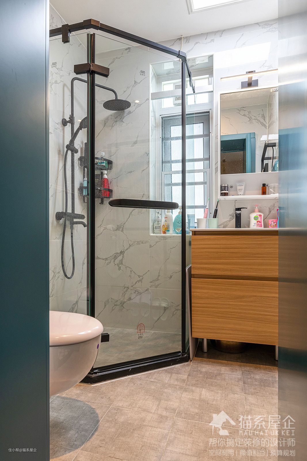 卫浴做了最基础的干湿分离,采用了黑色作为五金的颜色,隔断、花洒、搁架都是统一的黑色。跟外置的空间保持一致~ 利用右边的区域“塞”下了一个刚刚好的木质柜体,小小的镜前灯解决了由妈日常的化妆、卸妆需求。