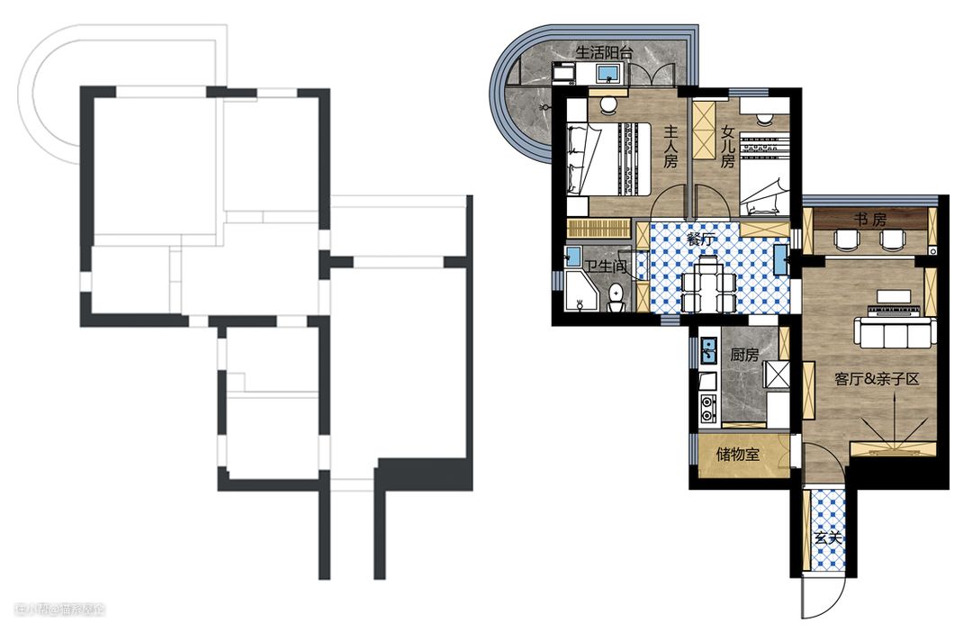 原户型(左图) ① 可以看到原户型厨房的面积过小,而小房间的利用率又不高。最让人抓狂的是一个好好的房间为啥门开在进门处???黑人问号脸。 ② 主卧与次卧之间存在着不规整的户型问题,导致餐厅是一个有菱角的区域。 ③ 厨房面积极小,有娃家庭必备的大冰箱、洗碗机、烤箱都不可能放得下。 针对上述需求,我们对老房子进行了改造。 改造后平面图(右图) ① 扩大了厨房的面积,将原来小房间的空间归置进厨房后,煮饭都变得快乐起来。而剩下的位置刚刚够被利用为一个储物间,放放清洁工具、行李箱等家庭大件,完美。 ② 将主卧的墙体改造后,两间卧室在格局上更为方正,餐厅也化菱角空间为方正空间,利用主卧凹位做了一个定制的衣柜。 ③ 原客厅阳台改造后成为一个亲子学习天地,阳台功能挪到主卧室阳台,避免双阳台功能重合,浪费空间~ ④的确是实现了各个空间都配备收纳的需求。