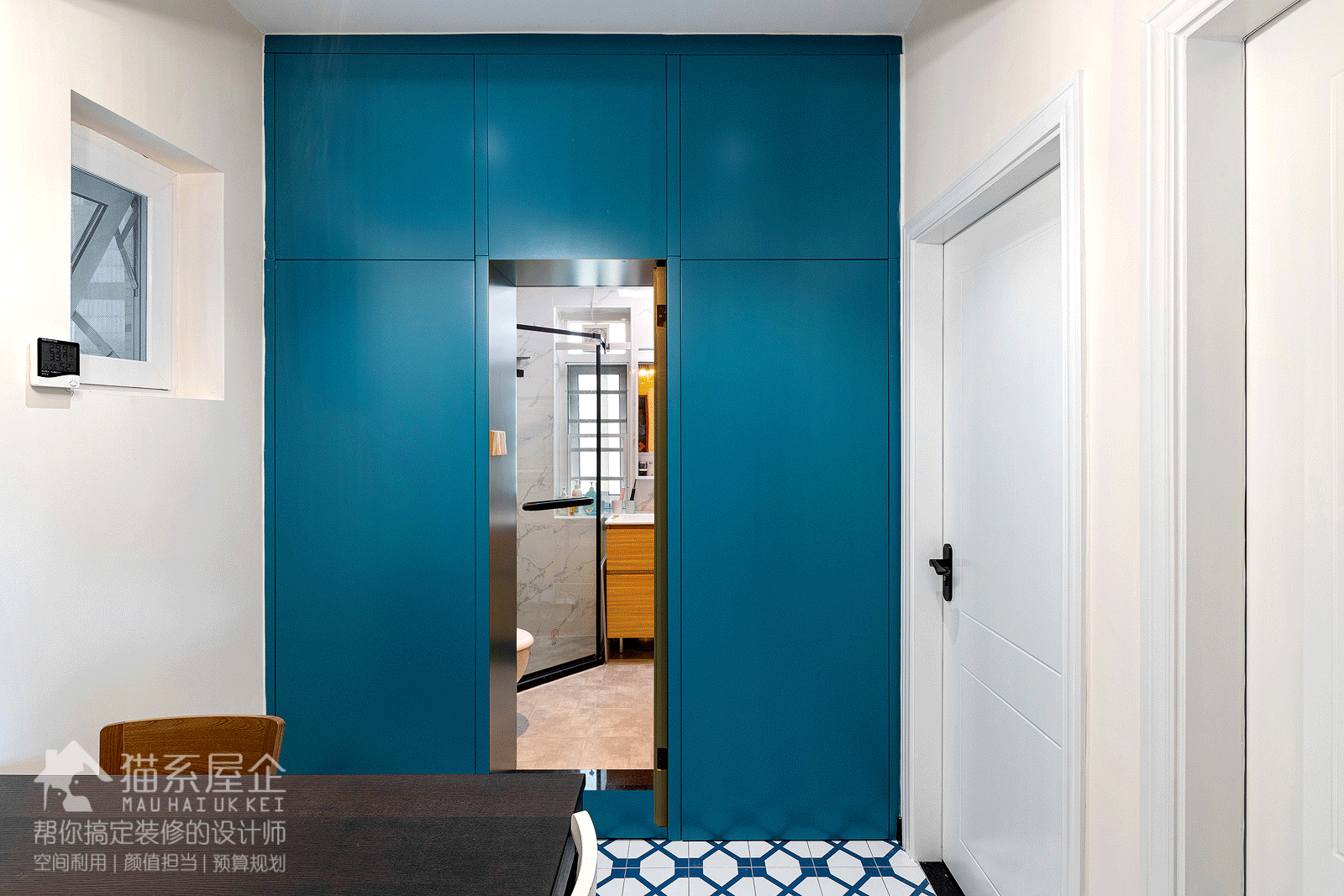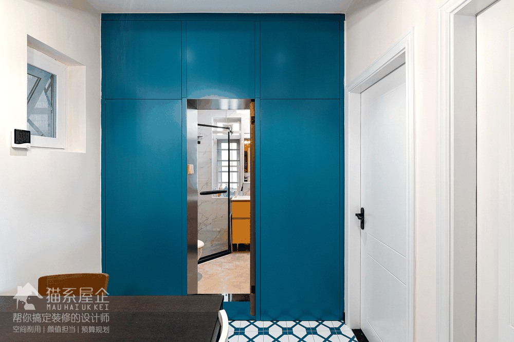 玄关作为一个家的回家担当,素有“玄关不好看,我就不回家”一说。 的确,作为一回家就要待着的过渡区域,跟大多数业主一样,由妈希望这个区域既具功能性,又有颜值可赏。 猫叔根据业主的喜好,设计了跟餐厅一样的花砖地块,区分和客厅功能的同时,又让整个家明亮活泼起来。 整面墙的白色柜体,在视觉上一点儿不显得拥挤,配上黑色拉手的点缀,现代感满满。 由妈回家的动线一般是换鞋-挂包-更衣-偶尔需要卸妆-直奔厨房做饭,玄关承担了这大部分的功能。 户型的设定决定了这部分是传统的长条形,起到天然的阻隔作用,不会在开门时便对里面一览无余,保障了一定的隐私。 这种户型在风水上也有不会露财的说法哟嘻嘻(突然小迷信一下)。