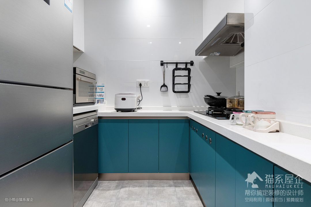 扩容后的厨房宽敞明亮,同样是蓝色系的柜门,L型的操作台面,从此成为由妈大展身手的居心地。 整屋的门、包括厨房的窗框、台面都是百搭的白色系的,蓝白色的养眼程度让人像是进入了地中海的度假区~