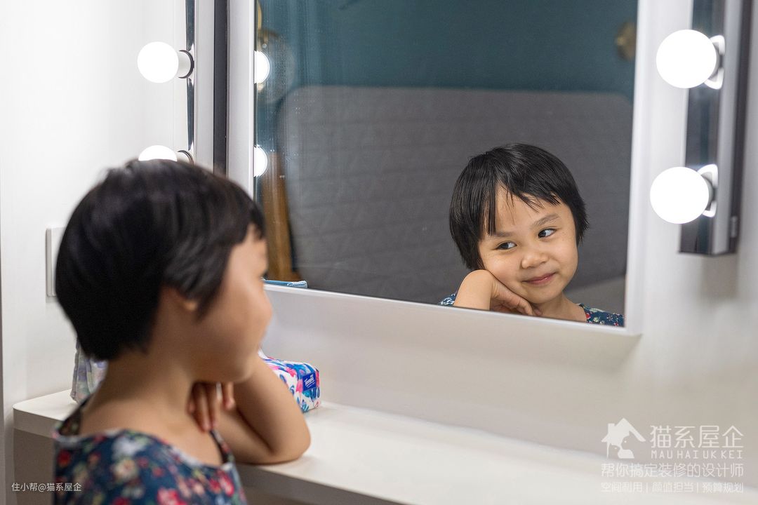 在节省空间的原则下,设计师利用了搁板做了一个简约型的化妆台,很别致。这个自带化妆灯的梳妆镜是某些ins网红博主家的同款,灰常实用。