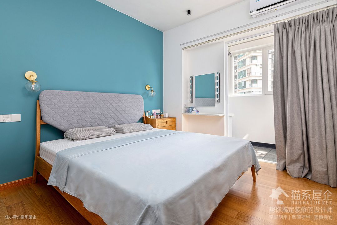 主卧带阳台,也刷了整面墙的蓝色,配上香槟金的床头灯很显精致,一股妥妥的轻奢风扑面而来。小小的床头灯满足了由妈睡前阅读的习性。