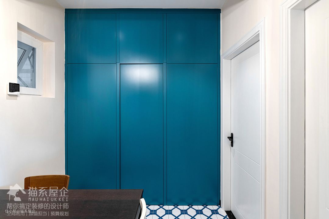餐厅铺设了和前面玄关一致的蓝白色花砖,因为这是一个内置空间,跳跃感的花砖能让整个区域瞬间活跃起来。吃饭的心情都会变好呀~