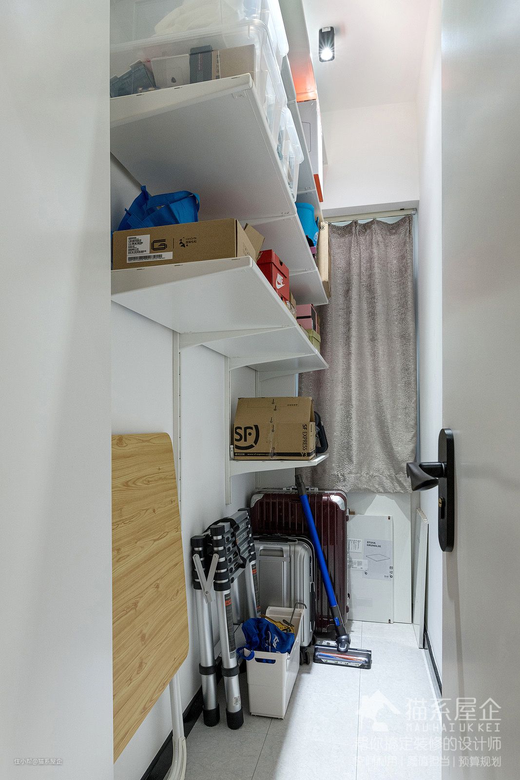 原来的小房,被改成了储物间。开放式的收纳,一目了然,拿取自如。 家里的清洁工具。行李箱、闲置家具都被安置在这个空间内,妥帖整齐。