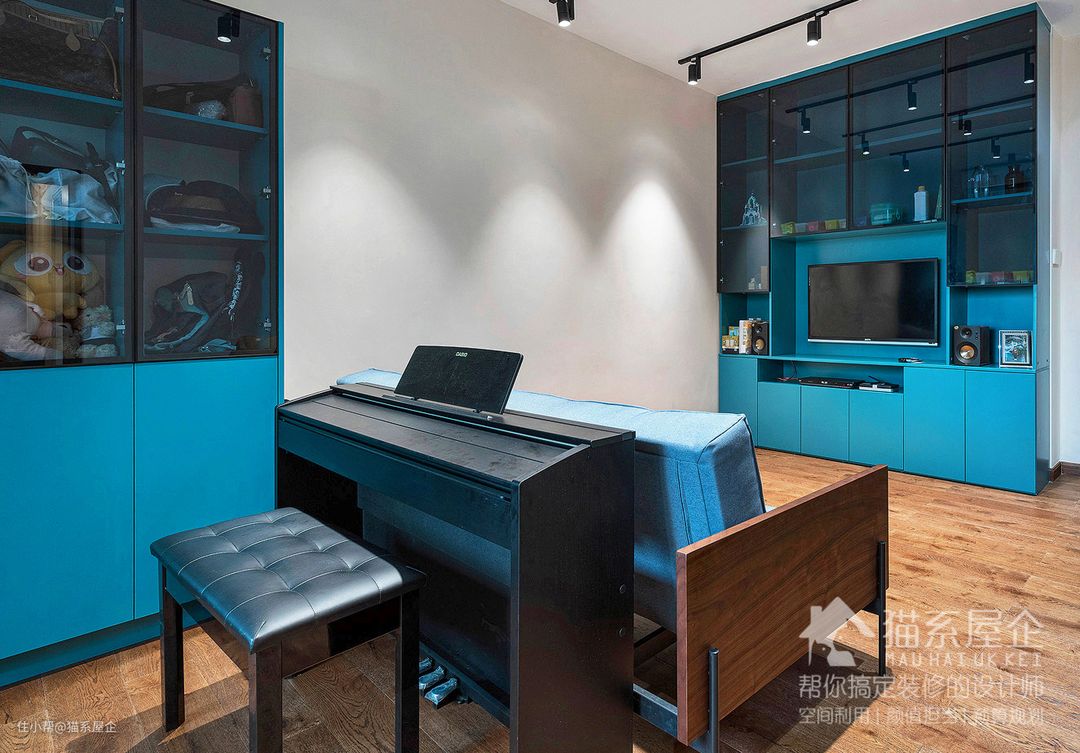 沙发和电视柜都是深海洋蓝色。家里的收纳柜都是根据由妈喜欢的蓝色海洋定制的。她说这也是由姐的心头好之一。 所有的柜体也采用开放+封闭的组合形式,既具备收纳性,又兼顾展示性。在开放柜体做了玻璃柜门,避免落灰的问题。