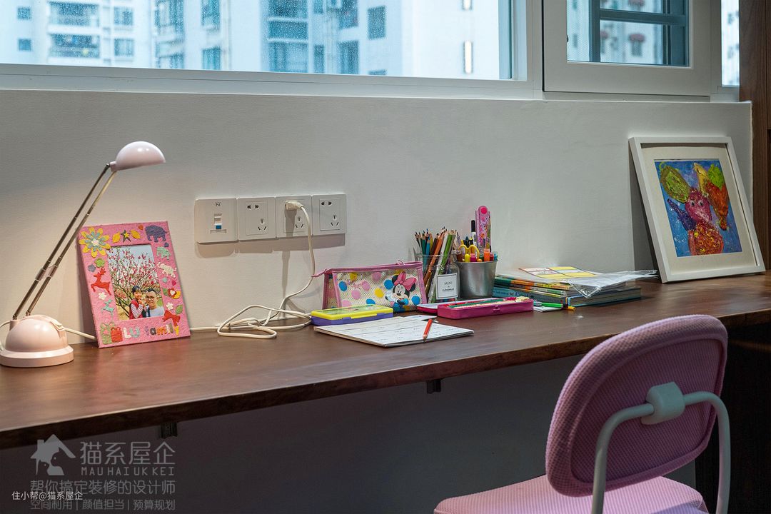同样用了黑框玻璃隔断,由姐独自学习的时候,既可以和爸爸妈妈在同一个区域,又能安静学习。 孩子喜欢的彩色跟冷静沉着的胡桃木色居然也能擦出和谐的花火~