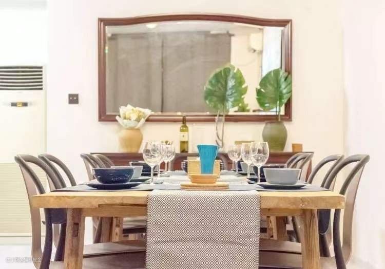 改造后的餐厅,调整了空调的位置,使餐厅空间完整美观。使用榆木大板做的餐桌既朴实又稳重,是聚会的中心区域。