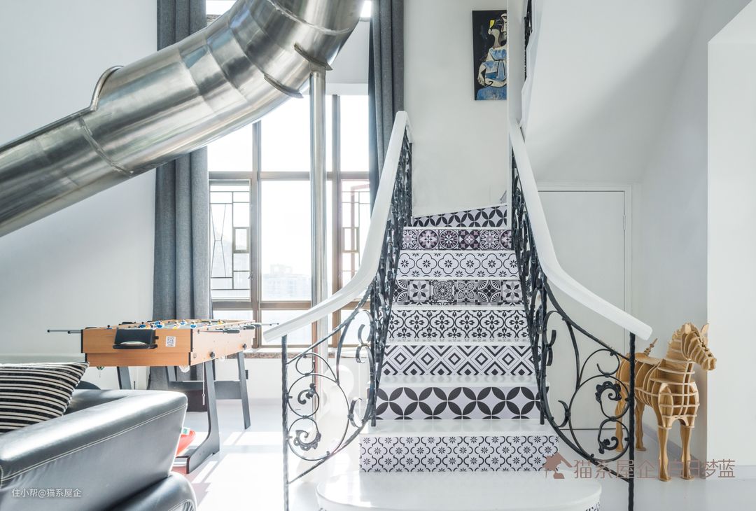 你能想象家里藏着一个10米长的大滑梯吗? 能!天台还有无敌CBD夜景+网红泡泡屋! 这是一个顶层的复式大宅,我们此次改造的重点是---一个酷炫绝版的亲子空间。 所以我们以白色为基调,利用复式的天然结构,在屋里造了一个滑梯,滑梯下是一个超大型的波波球池,还在天台放置了一个泡泡屋。 实现了“你在家里滑滑梯,我在沙发玩手机”的绝妙亲子空间构想。 除此之外,这还是一个定期聚会、呼朋引伴,大家来了都会爱上的爬梯(趴体)空间!