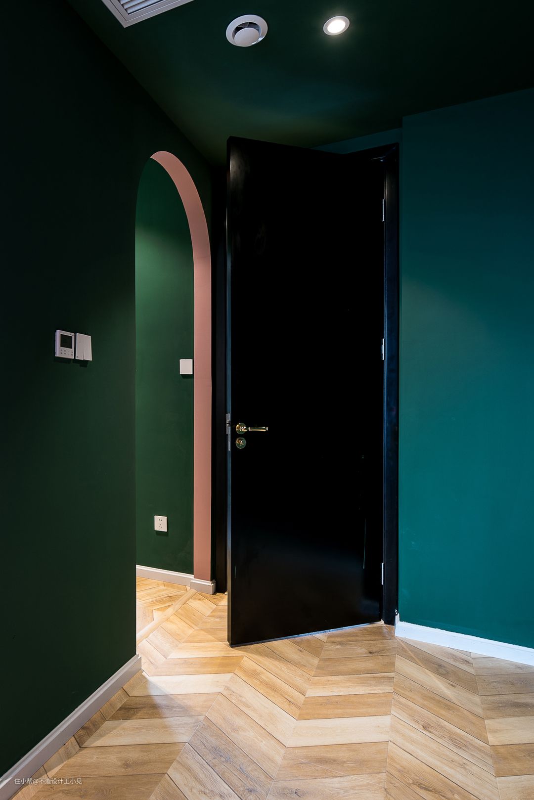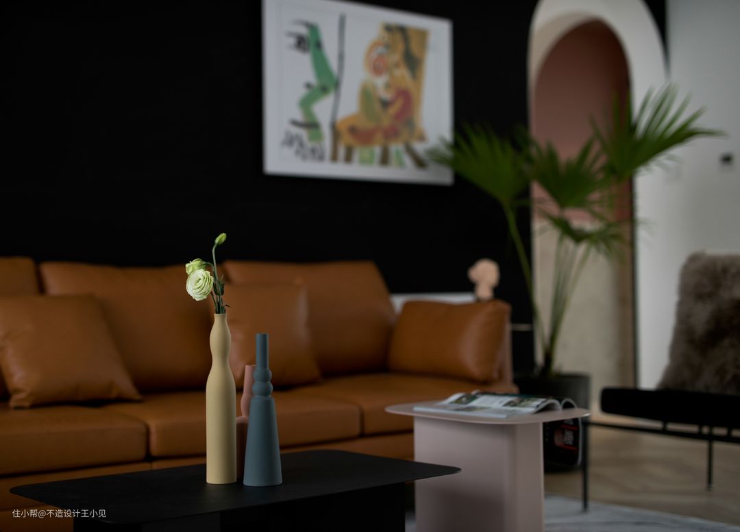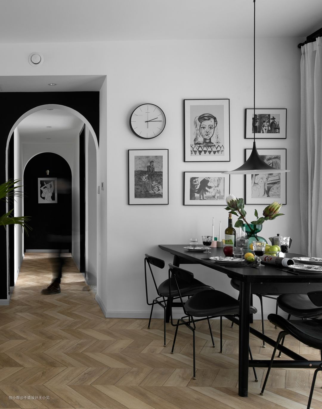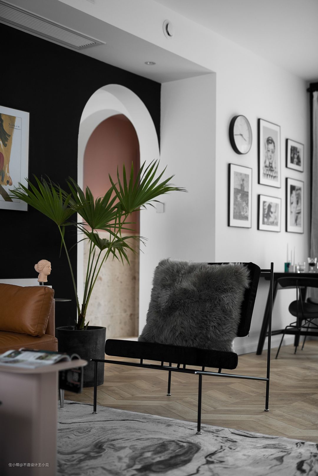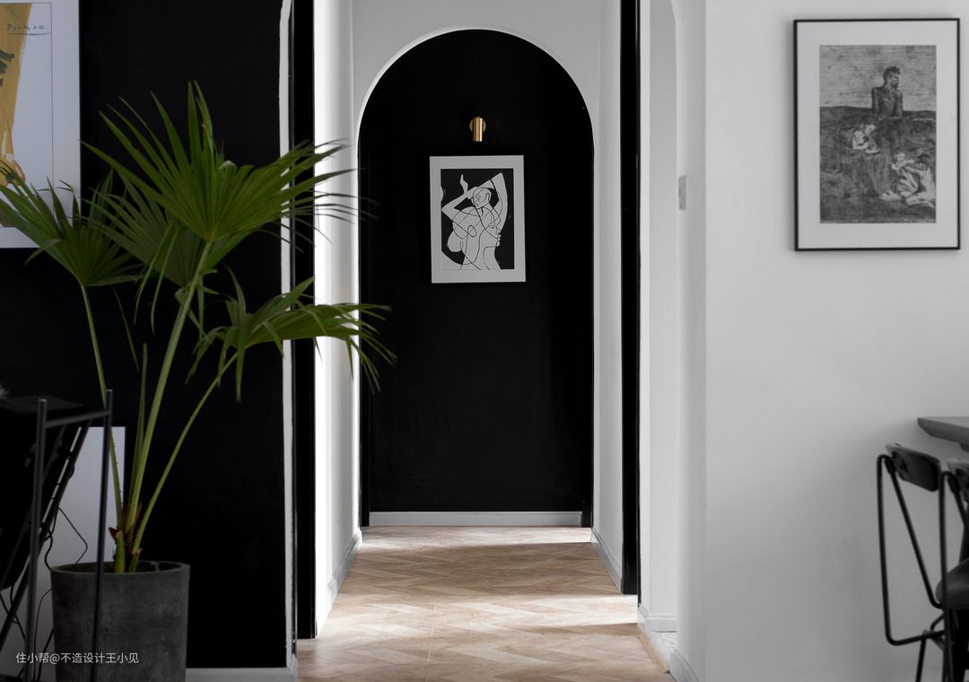 两个拱形门洞和洗手间的脏粉色中和了客厅非黑即白,有棱有角,比较硬朗的视觉感受。 在非黑即白的客厅中,随着角度不同可以看到次卫的脏粉色墙面,厨房的深绿色墙面以及装饰画。