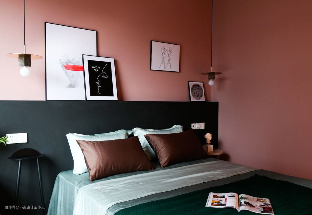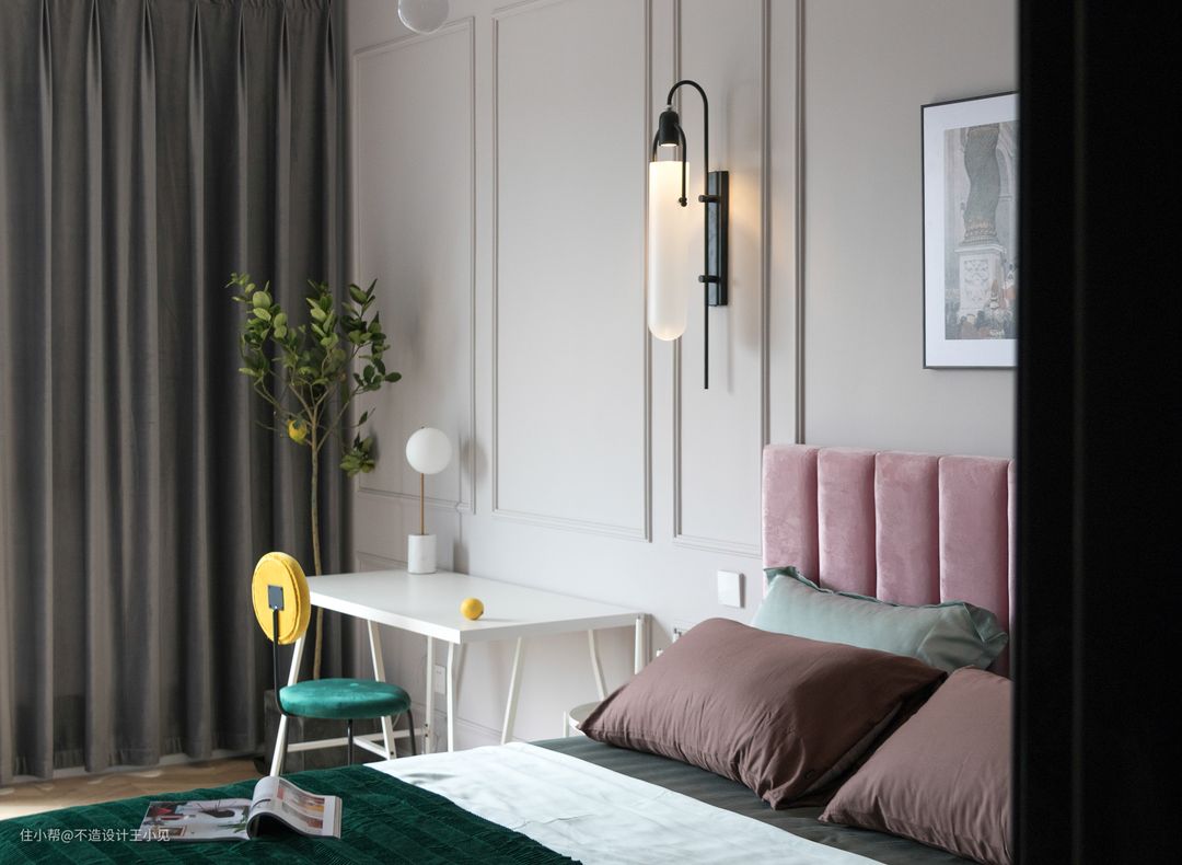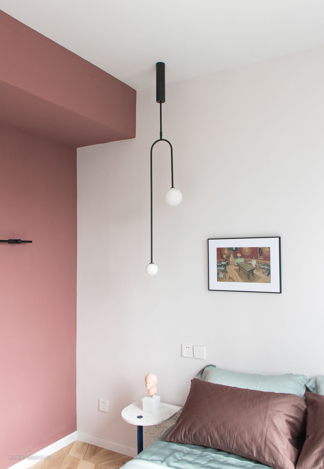 脏粉色调主卧,几个卧室都选了没有床头的床架,因为性价比更好,但是床垫买了非常舒服的。作为民宿,预算有限的情况下,没必要把钱花在床头上。如果预算够也可以再买一个性价比合适的。