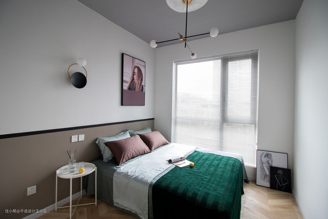 卧室并没有添置衣柜,不过预留了足够的可能性,后期居住后购买成品衣柜即可变身温暖卧室,高级的灰色乳胶漆使整个卧室温柔舒适。
