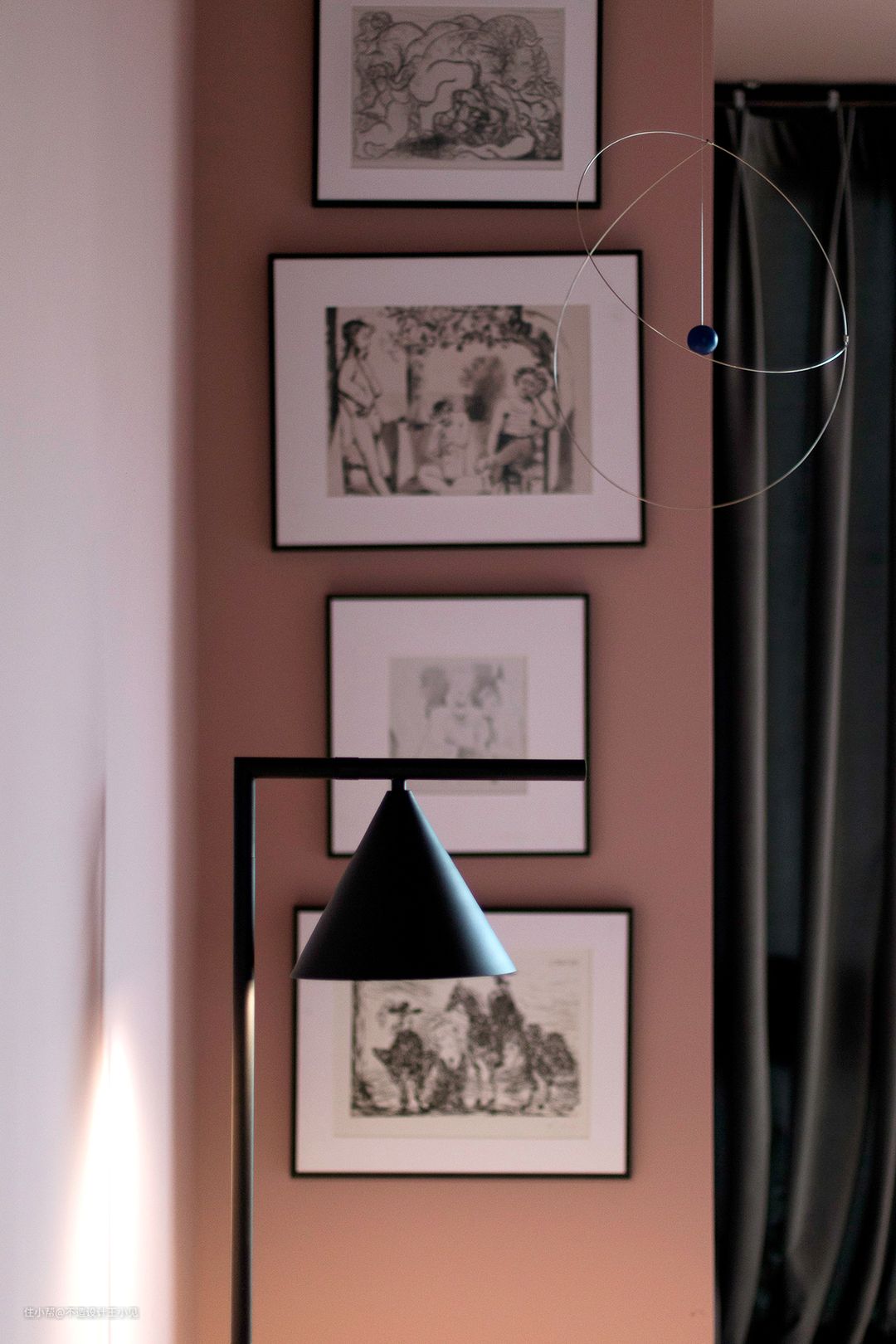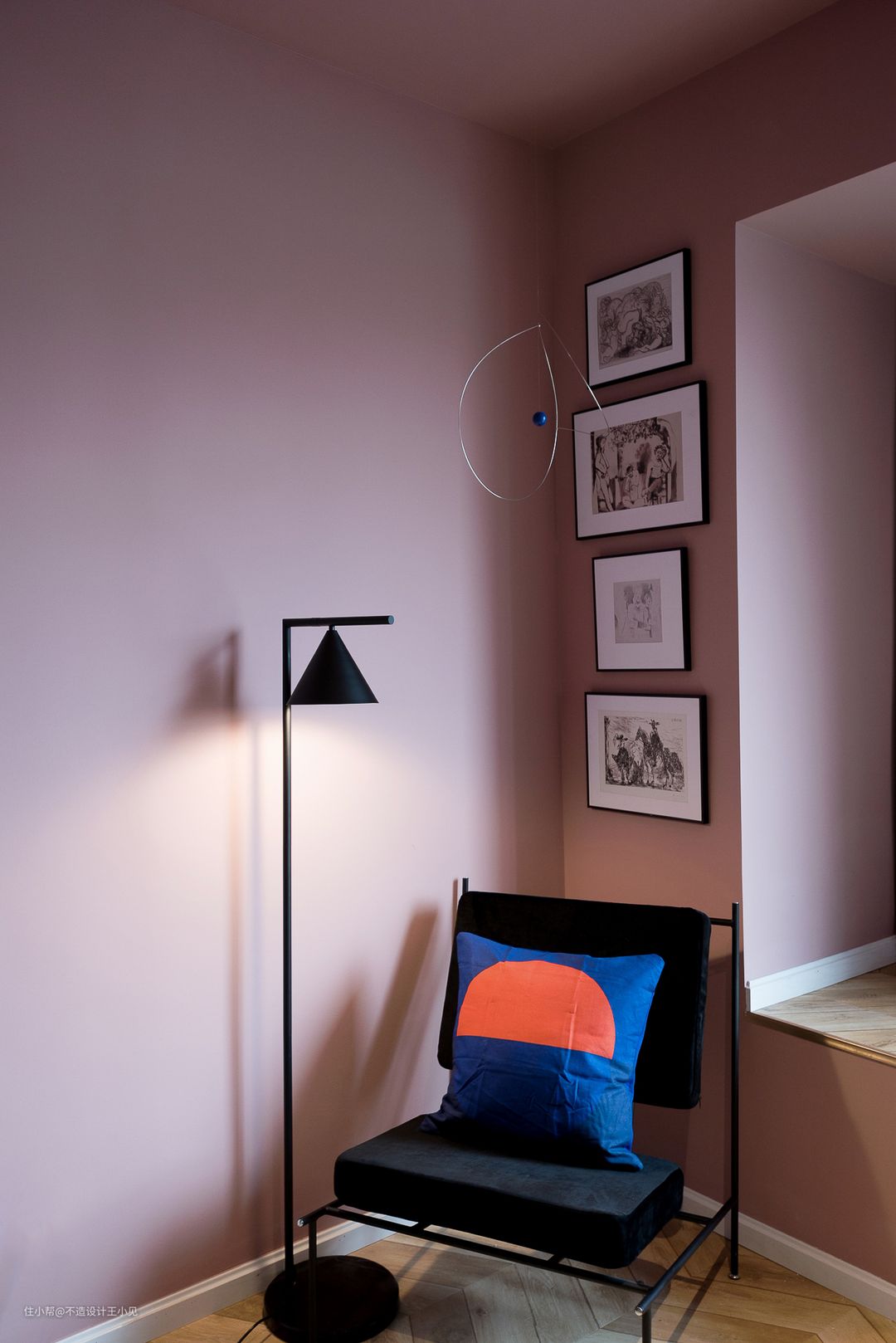 脏粉色卧室角落,虽然墙面是脏粉色,但为了让卧室给人的印象更加中性,选择了硬朗造型的单人椅和落地灯。