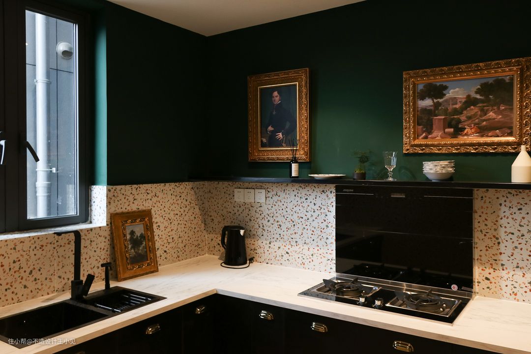 水磨石和墨绿色的乳胶漆,配合欧式的装饰画碰撞出别样的美感。