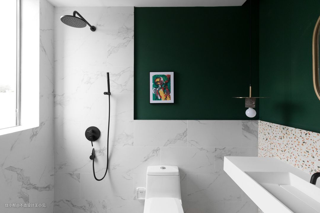 ●墨绿色防水乳胶漆颜色较重,没想到用到卫生间效果出奇的好,给人一种高雅明朗,富有生命力的感觉。 ●为了压一压墨绿色,避免压抑感,较大面积的铺贴白色大理石墙砖,提升卫生间通透感。 ●没有把墙砖贴满,而是使用了防水乳胶漆,一个是为了颜值,更重要的一个原因是为了节省预算。