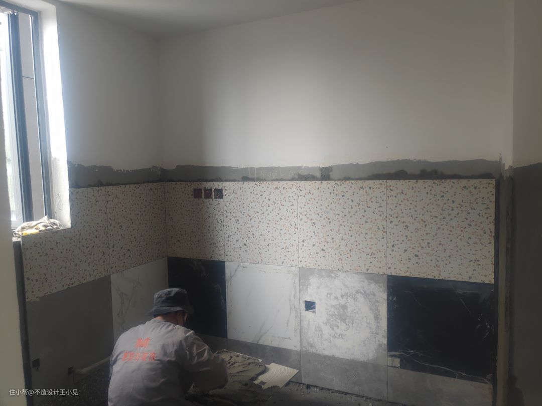 厨房的地柜遮挡住的区域是瓷砖卖家送的杂砖,没花钱哦 ,反正挡住也看不见。(这个只要给卖家提,基本都是可以赠送的哦)