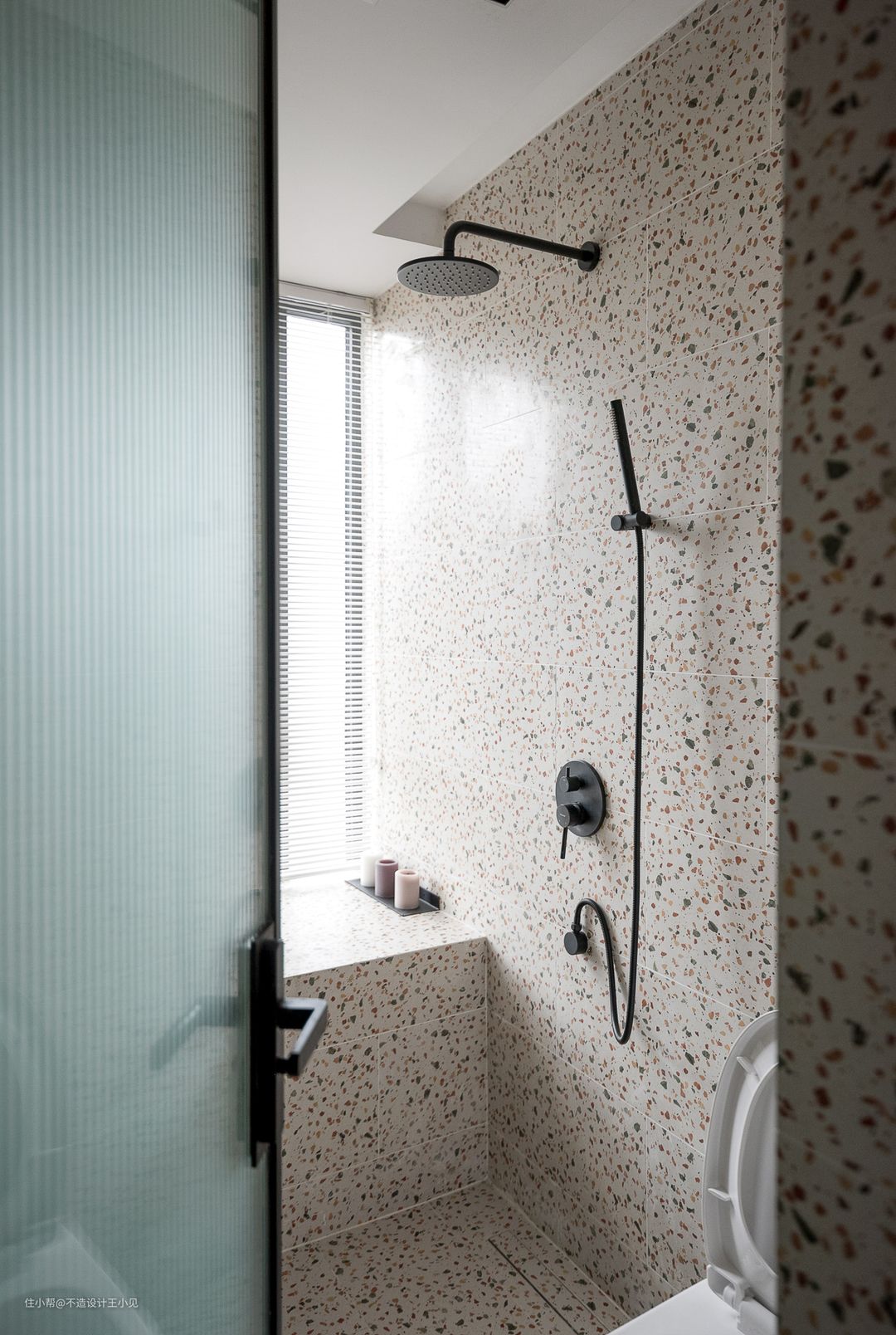 水磨石保持了墙砖和地砖一致,暗埋的淋浴花洒简洁感十足,隐形地漏和防潮石膏板吊顶也必不可少