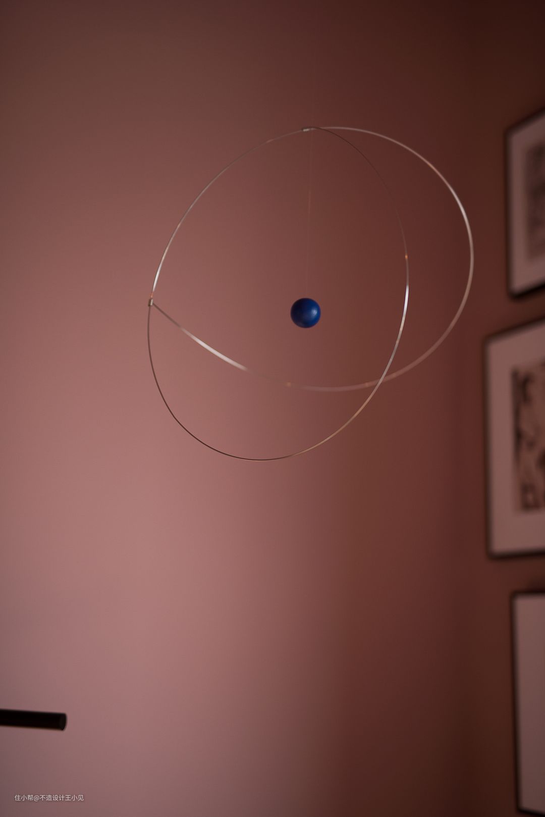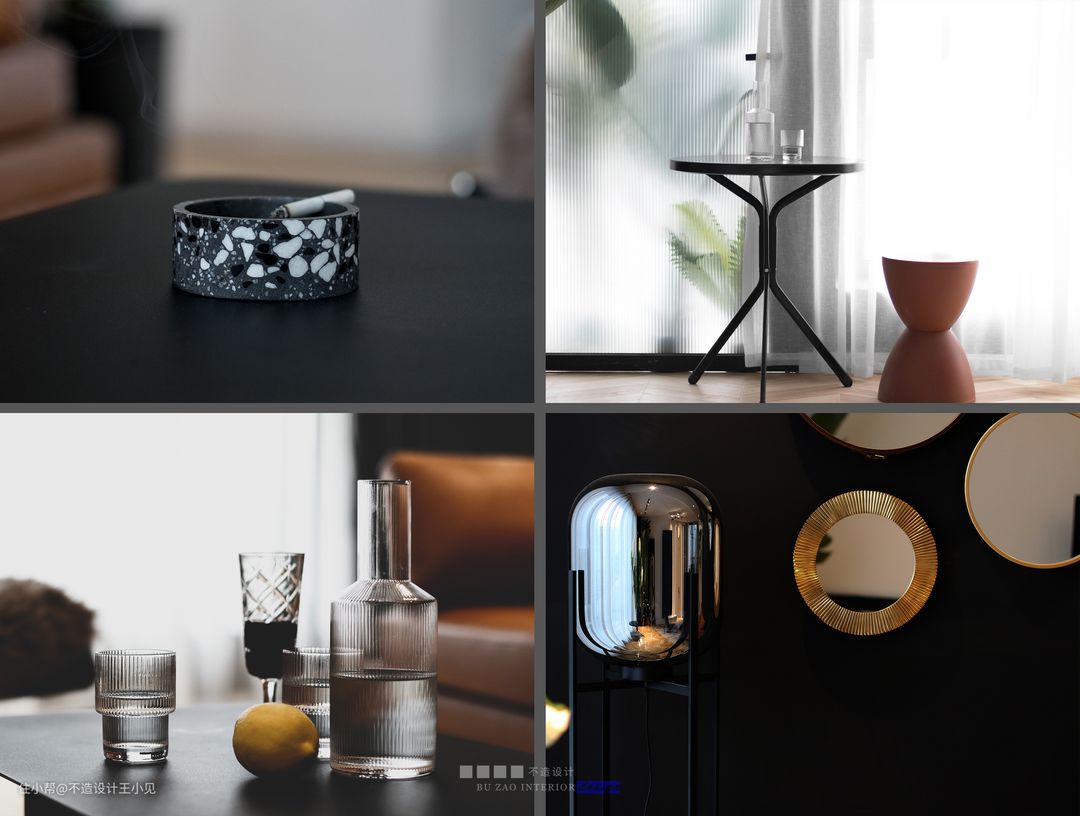 为了给黑色的背景墙透透气,加入了三款金属边框材质的圆镜,大小比例的控制也非常重要。