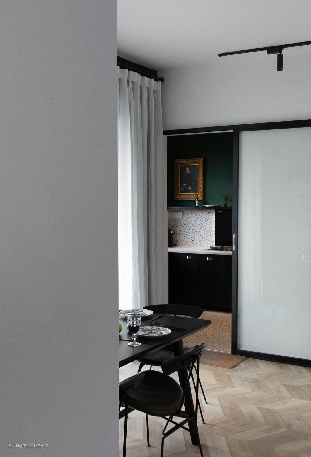 从餐厅看厨房,简洁的轨道玻璃门和黑色的餐桌是不是很搭呢。