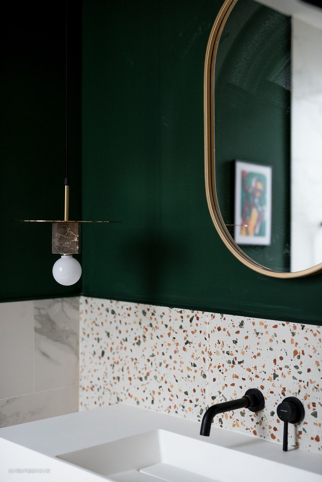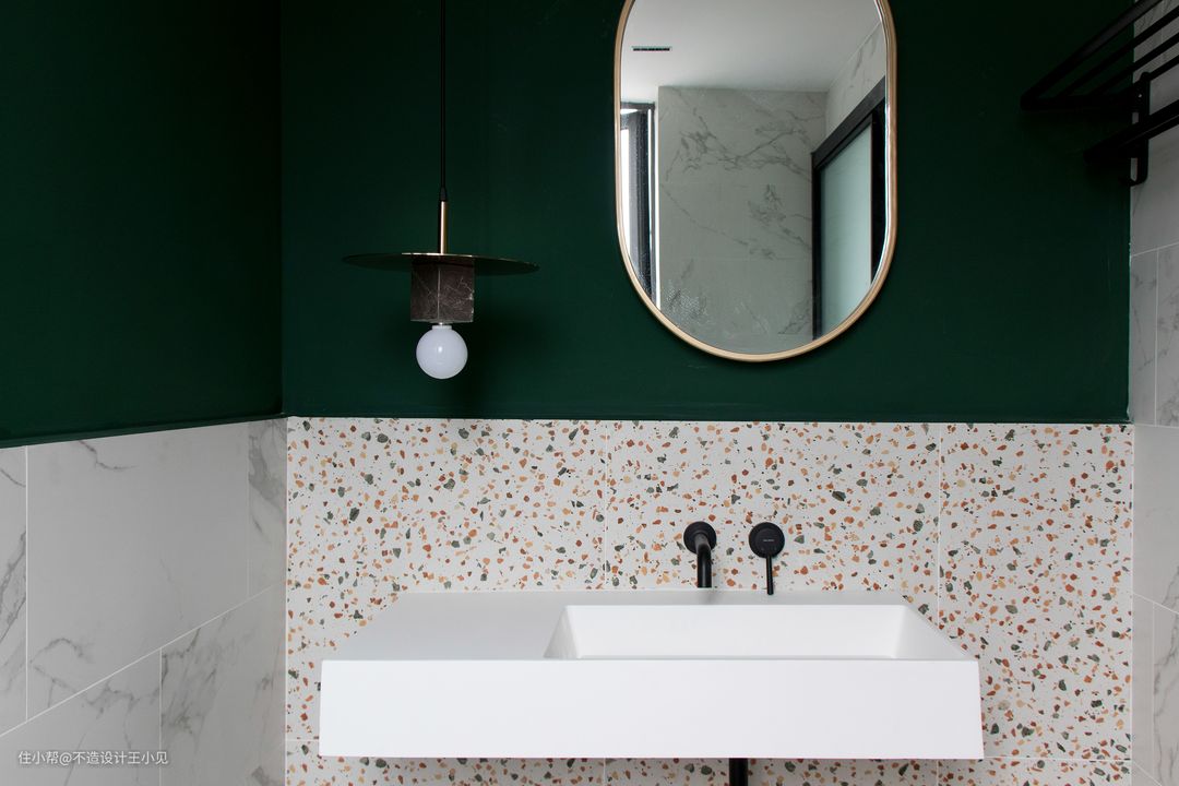 ●水磨石中的绿色颗粒与墨绿色防水乳胶漆相呼应,白色背景与白色大理石墙砖相呼应,让卫生间变得更加活波调皮又不突兀。 ●纯白色亚克力的台盆和整个空间气质很搭。