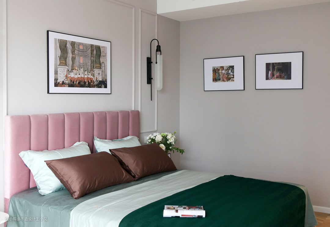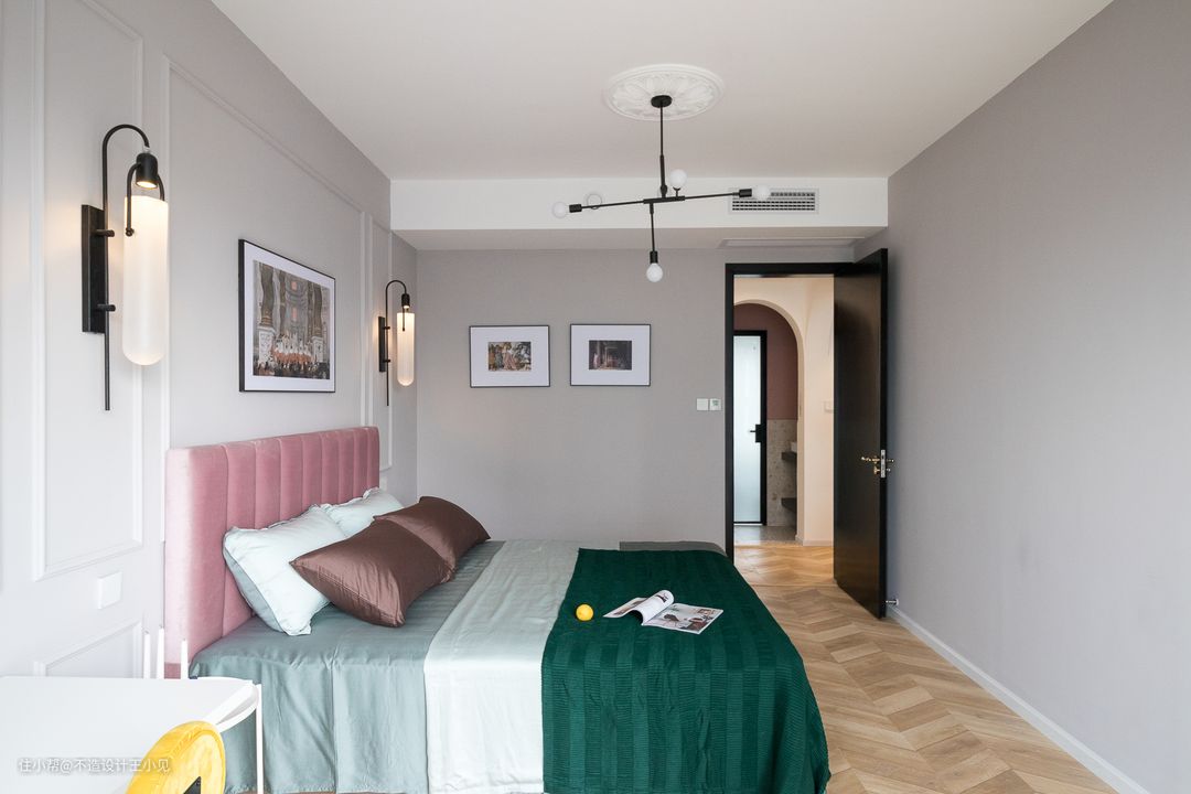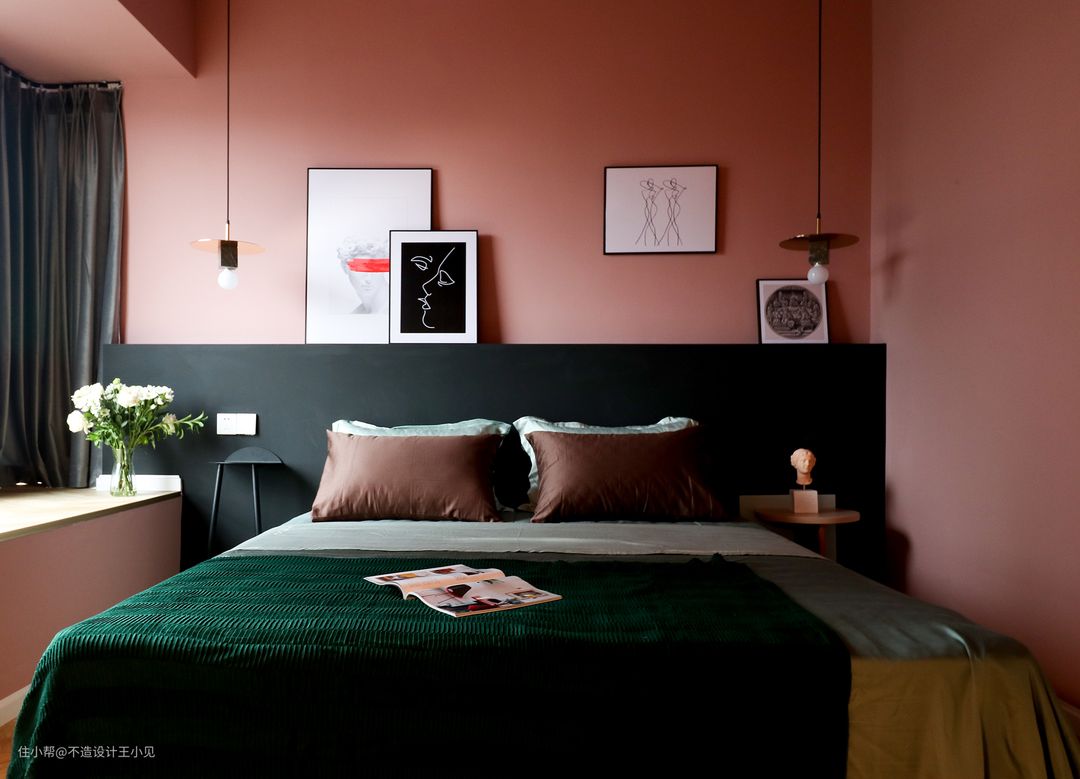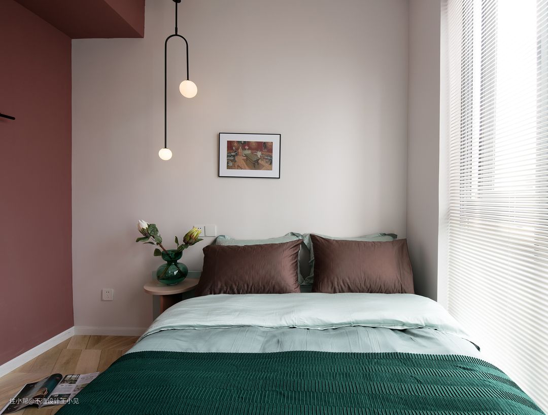 脏粉色调主卧,几个卧室都选了没有床头的床架,因为性价比更好,但是床垫买了非常舒服的。作为民宿,预算有限的情况下,没必要把钱花在床头上。如果预算够也可以再买一个性价比合适的。