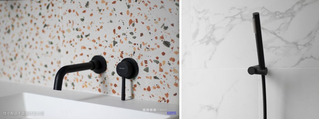 水磨石保持了墙砖和地砖一致,暗埋的淋浴花洒简洁感十足,隐形地漏和防潮石膏板吊顶也必不可少