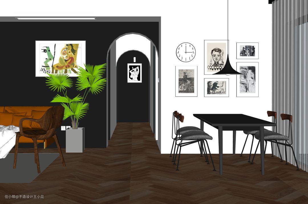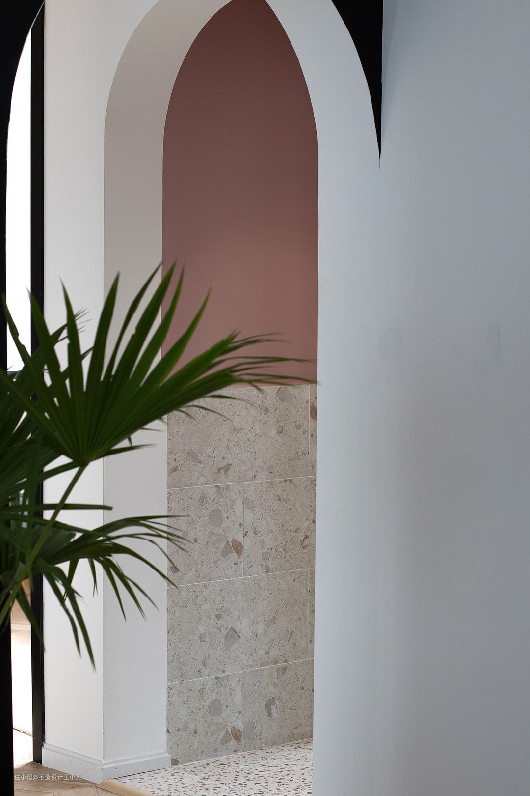 两个拱形门洞和洗手间的脏粉色中和了客厅非黑即白,有棱有角,比较硬朗的视觉感受。 在非黑即白的客厅中,随着角度不同可以看到次卫的脏粉色墙面,厨房的深绿色墙面以及装饰画。