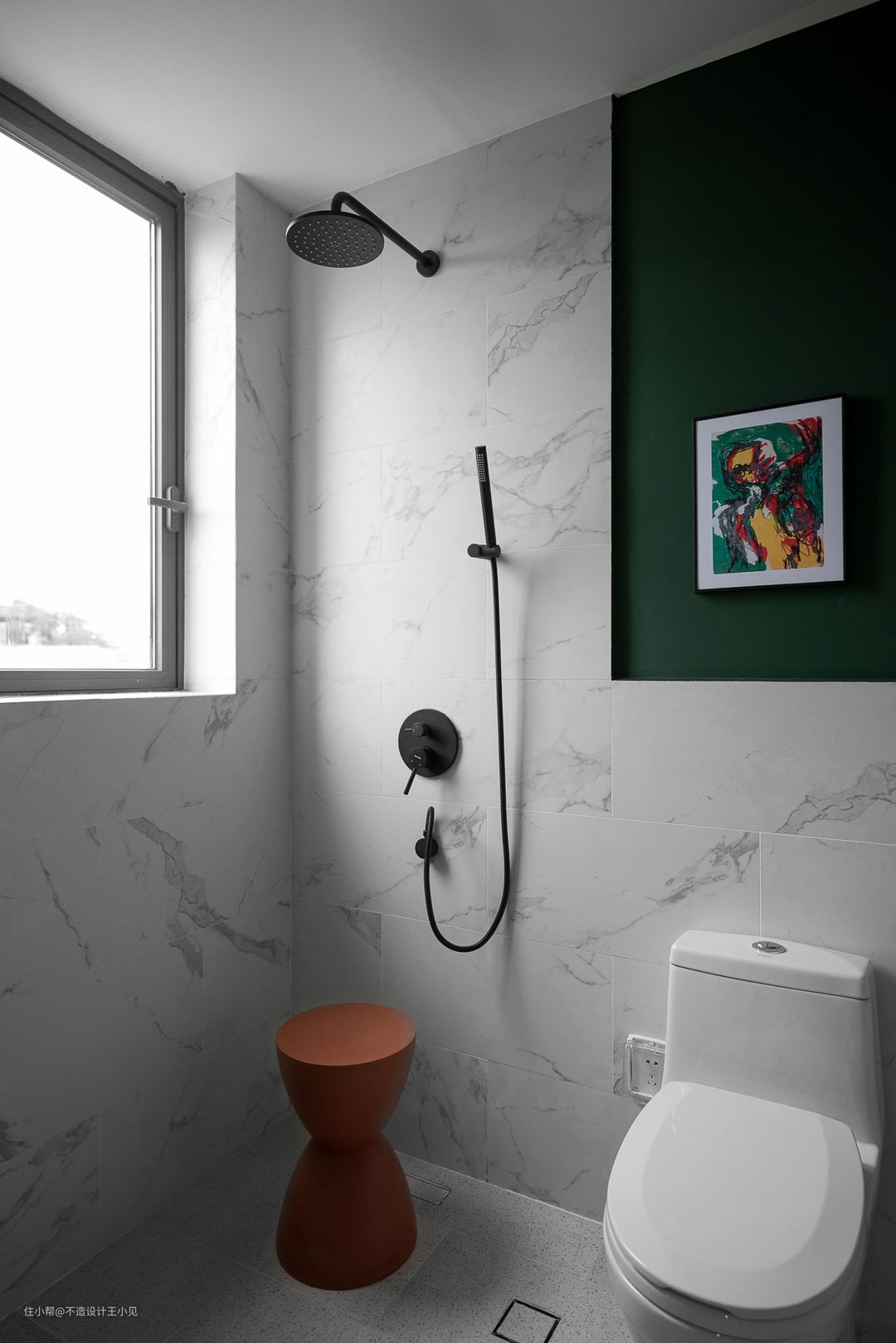●墨绿色防水乳胶漆颜色较重,没想到用到卫生间效果出奇的好,给人一种高雅明朗,富有生命力的感觉。 ●为了压一压墨绿色,避免压抑感,较大面积的铺贴白色大理石墙砖,提升卫生间通透感。 ●没有把墙砖贴满,而是使用了防水乳胶漆,一个是为了颜值,更重要的一个原因是为了节省预算。