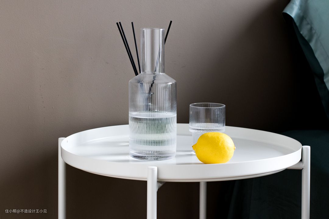 条纹的冷水瓶和冷水杯,和整个客厅的气质很搭; 落地灯和墙上的金属圆镜提升了质感。