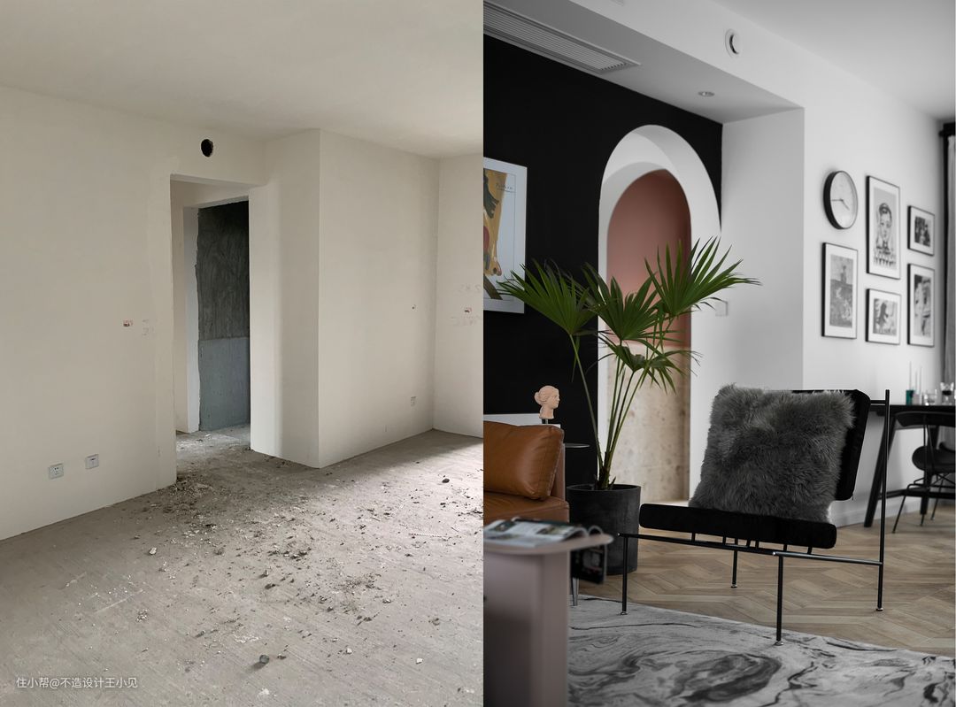 前后对比的空间魔法,黑白分明的空间氛围也不失色彩的冲击。