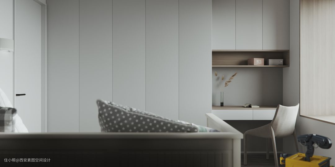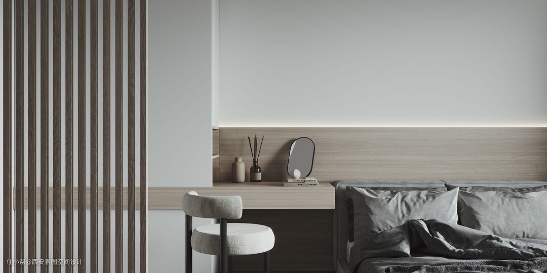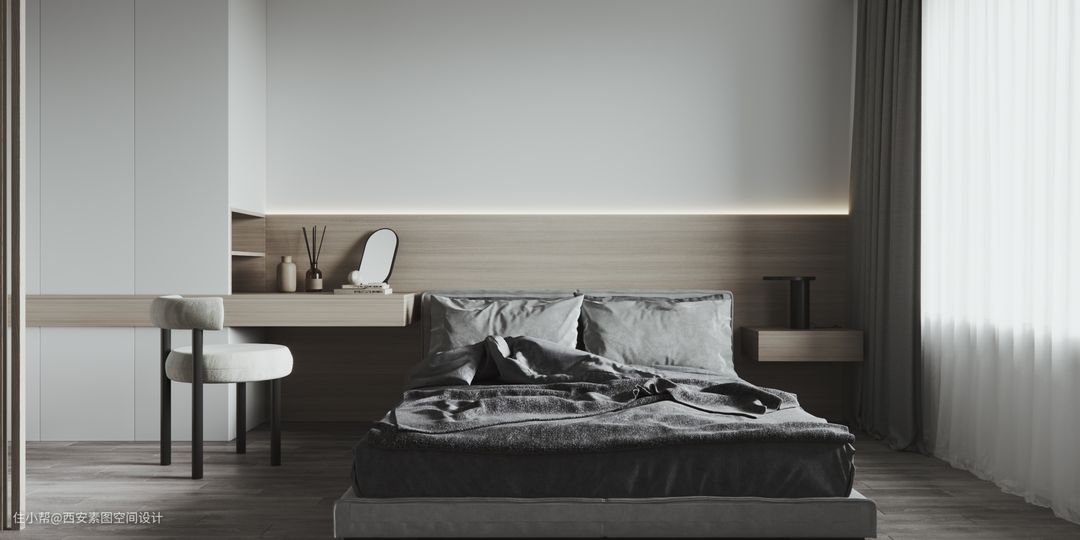 主卧强调了储物和实用性,大面积使用木色和白色来搭配。梳妆台从衣柜侧面延伸出来和床头柜相呼应。
